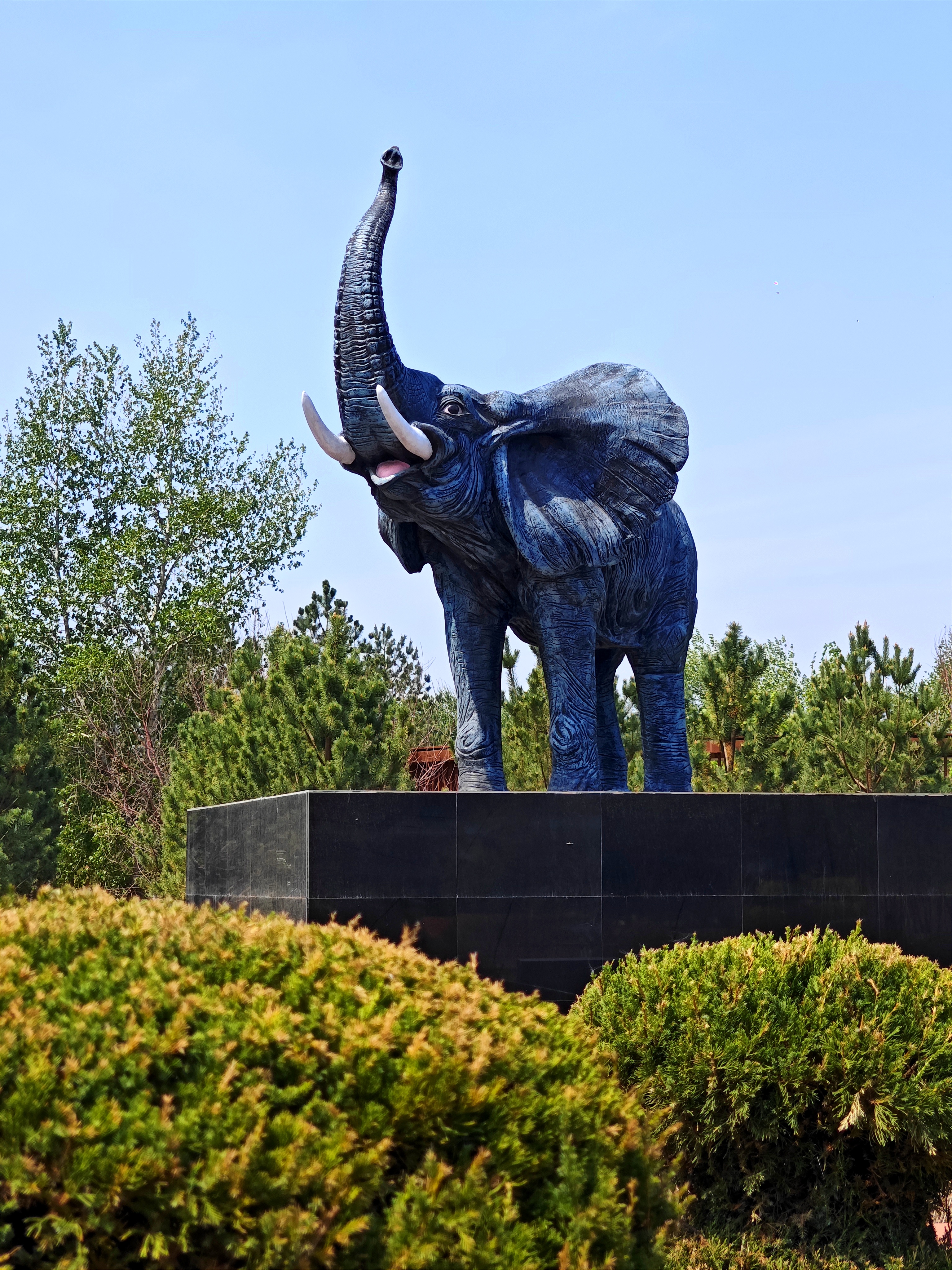 大象——深灰色,象牙潔白、雙眼圓睜、兩耳后貼、象鼻朝天似張嘴高鳴,雕像高大威猛、栩栩如生。