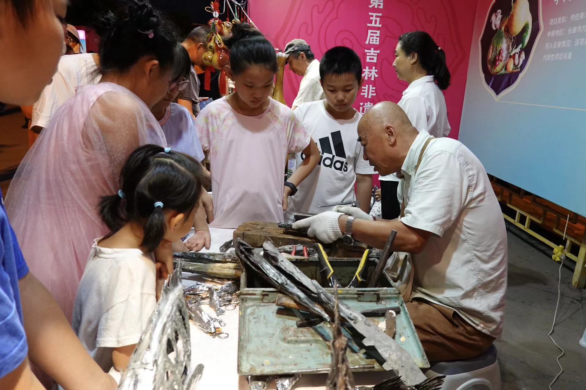 吉林非遺節已連續舉辦五屆,深受群眾歡迎。圖為第五屆吉林非遺節中,現場展示的非遺技藝受到小朋友們喜愛。 裴雨虹/攝