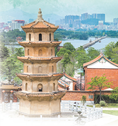 位于福建省泉州市晉江市安海鎮安平橋景區的安海白塔,與安平橋共同構成“白塔凌空,長橋跨海”的壯美畫面。陳 鈞攝(影像中國)