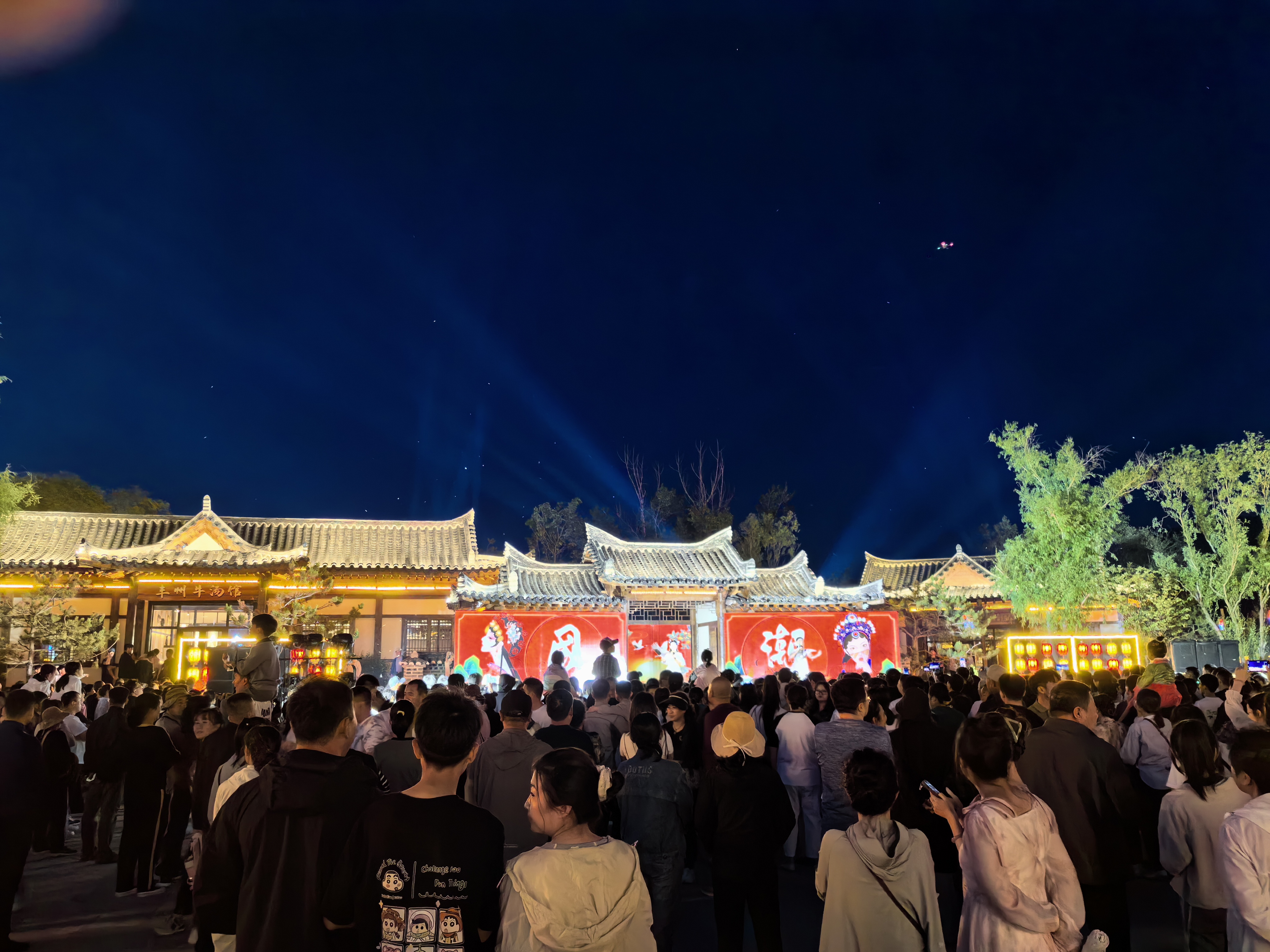傍晚時分,篝火點燃。游客在京祜塔下放花燈、送祝福,欣賞國潮表演,在美麗的星空下圍繞著升騰的篝火踏歌起舞,用舞姿傳遞熱情,用笑容展現(xiàn)喜悅。
