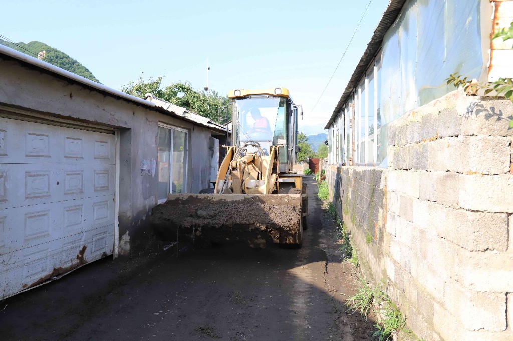 山洪過后,天空放晴,當地黨員干部群眾和各部門支援人員,正齊心協力開展清淤等災后恢復重建工作。