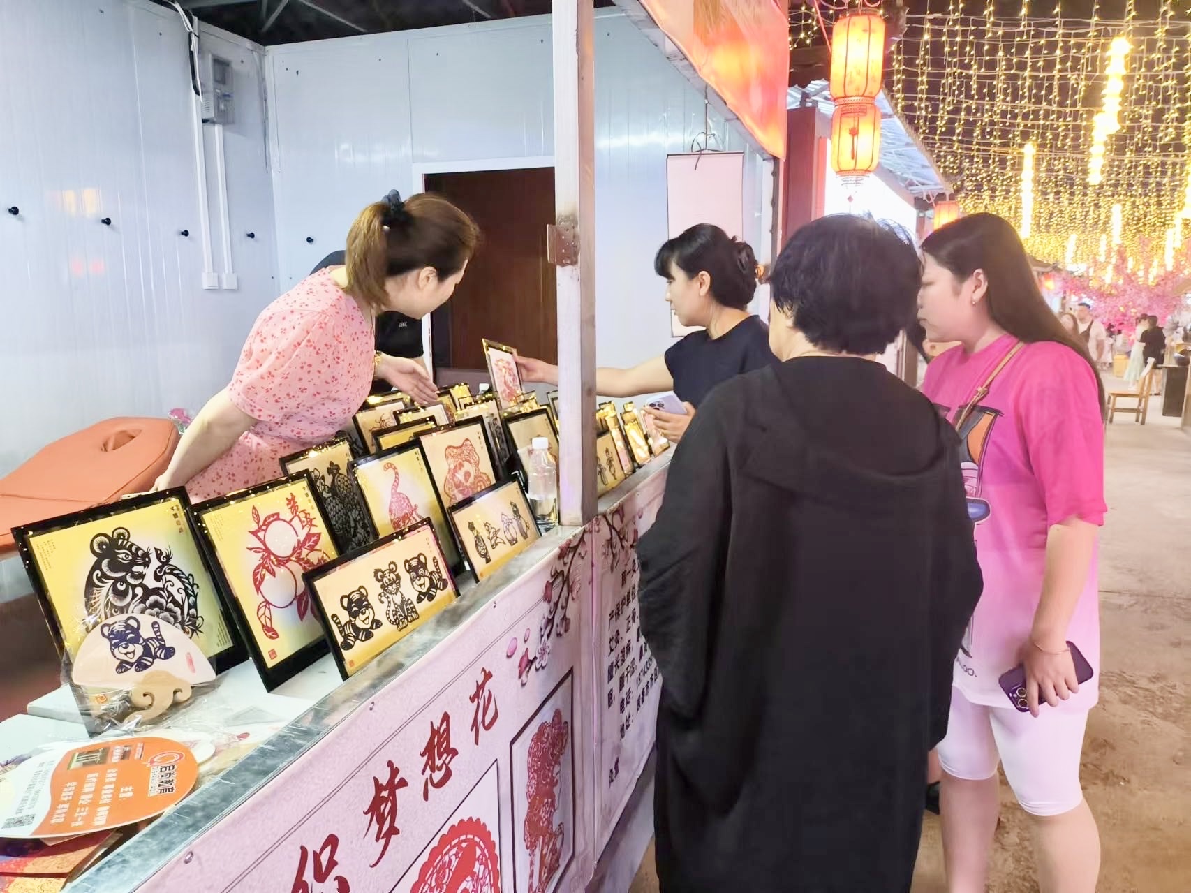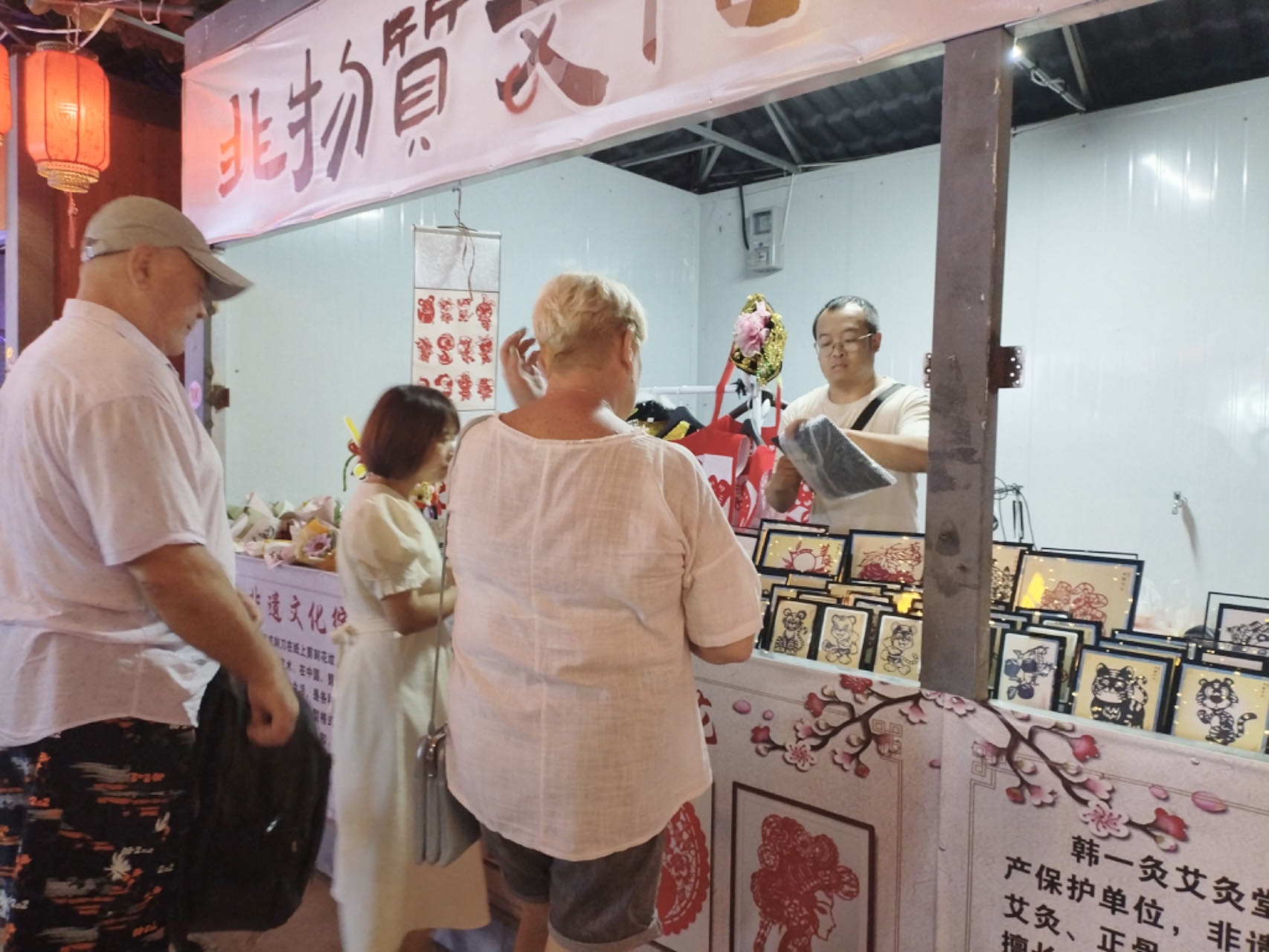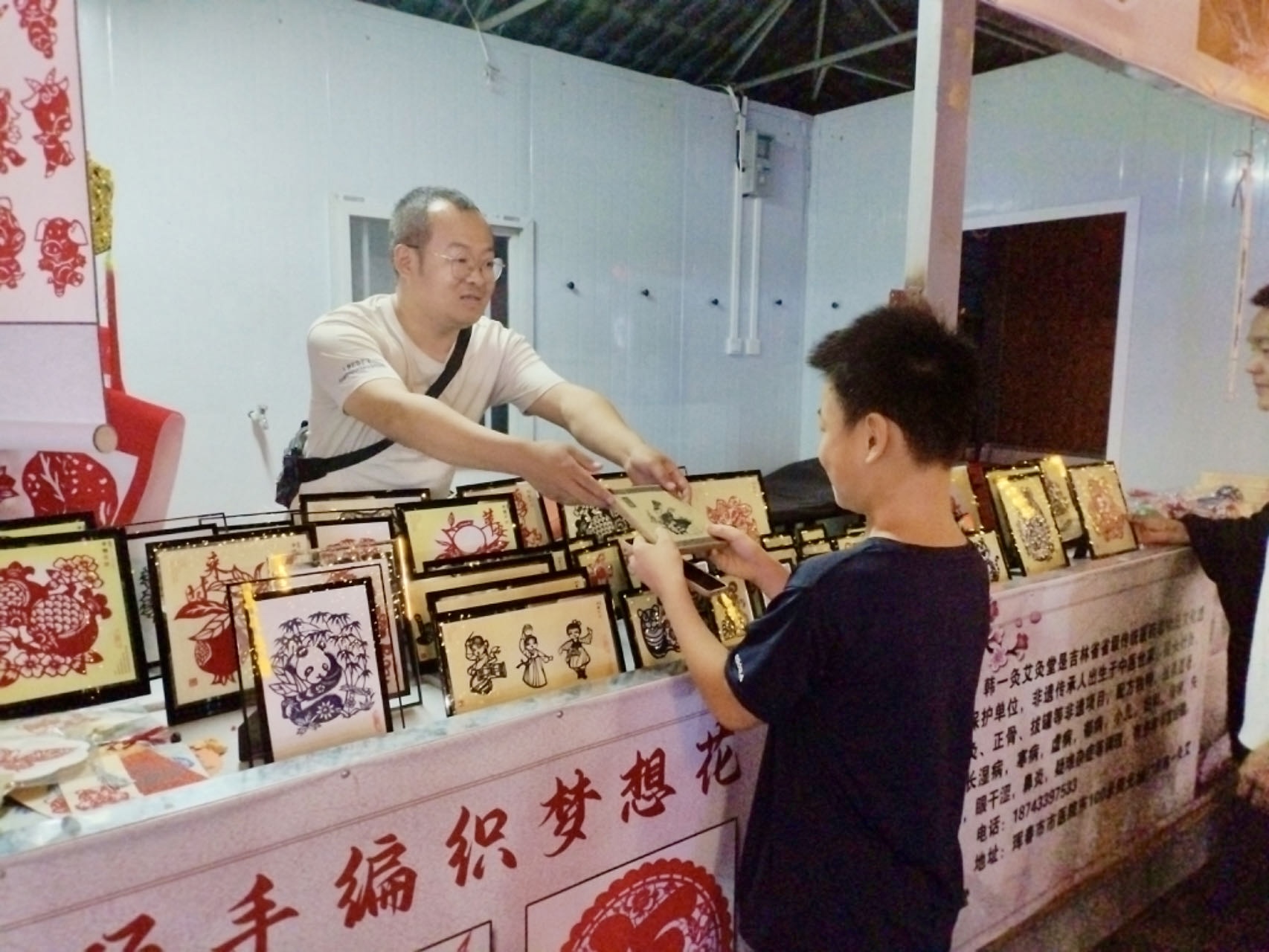 “一剪之趣奇神功,美在民間永不朽”。郭沫若先生曾用這樣美妙的詩句來贊美我國的民間剪紙藝術,剪紙,讓傳統與現代交織,綻放出別樣的光彩。在漢唐街夜市,永盛社區的非遺剪紙攤位向市民及游客展示著非物質文化遺產的無窮魅力和獨特風采。琳瑯滿目的剪紙作品在相框的映襯下格外光彩奪目,剪紙圖案更是豐富多彩:有呆萌的十二生肖、多民族人物剪紙、生動的花鳥魚、復雜精細的山水畫、傳奇的歷險故事《西游記》、國寶大熊貓、福字以及諧音梗剪紙作品,每一幅都生動可愛、栩栩如生。而這些惟妙惟肖的剪紙作品也通過不同的形式展現出來,有相框、有扇子、有書簽,還有卷軸……“好朋友們明年高考,這些剪紙書簽送給他們,希望能金榜題名,考上自己理想的大學!”攤位前,一位北京游客精挑細選了5個“金榜題名”剪紙書簽,心滿意足。