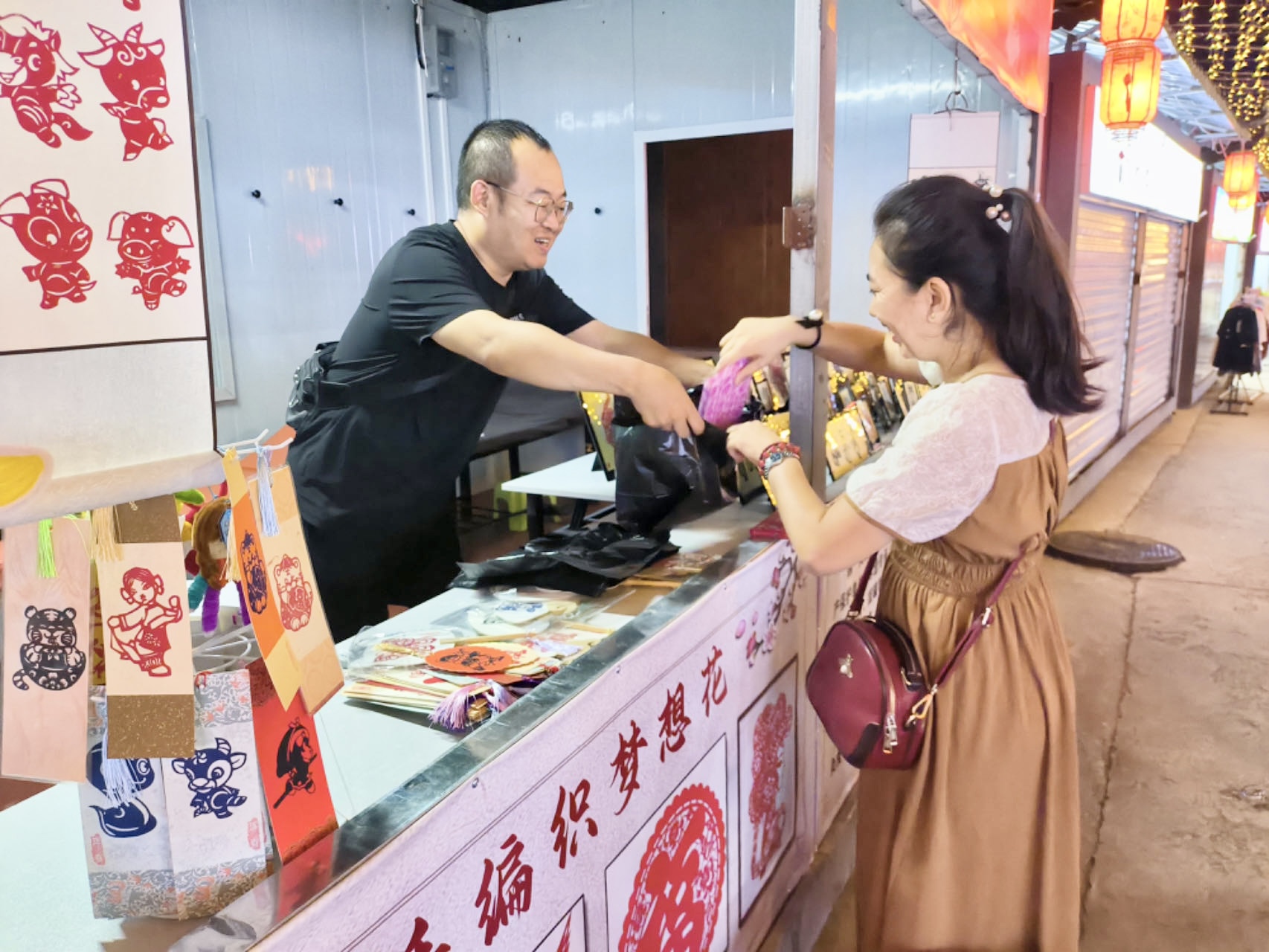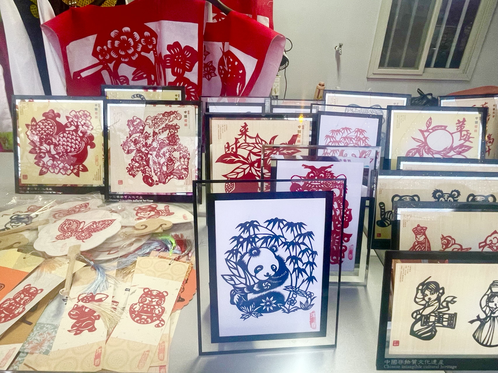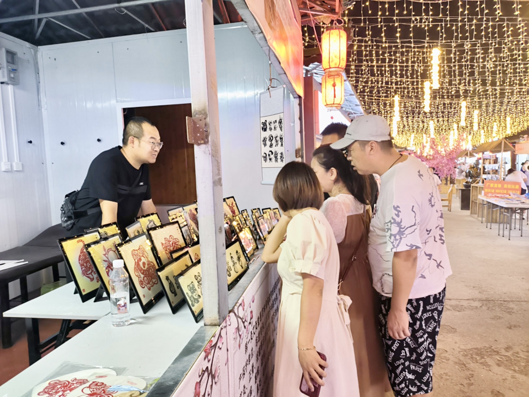 “一剪之趣奇神功,美在民間永不朽”。郭沫若先生曾用這樣美妙的詩句來贊美我國的民間剪紙藝術,剪紙,讓傳統與現代交織,綻放出別樣的光彩。在漢唐街夜市,永盛社區的非遺剪紙攤位向市民及游客展示著非物質文化遺產的無窮魅力和獨特風采。琳瑯滿目的剪紙作品在相框的映襯下格外光彩奪目,剪紙圖案更是豐富多彩:有呆萌的十二生肖、多民族人物剪紙、生動的花鳥魚、復雜精細的山水畫、傳奇的歷險故事《西游記》、國寶大熊貓、福字以及諧音梗剪紙作品,每一幅都生動可愛、栩栩如生。而這些惟妙惟肖的剪紙作品也通過不同的形式展現出來,有相框、有扇子、有書簽,還有卷軸……“好朋友們明年高考,這些剪紙書簽送給他們,希望能金榜題名,考上自己理想的大學!”攤位前,一位北京游客精挑細選了5個“金榜題名”剪紙書簽,心滿意足。