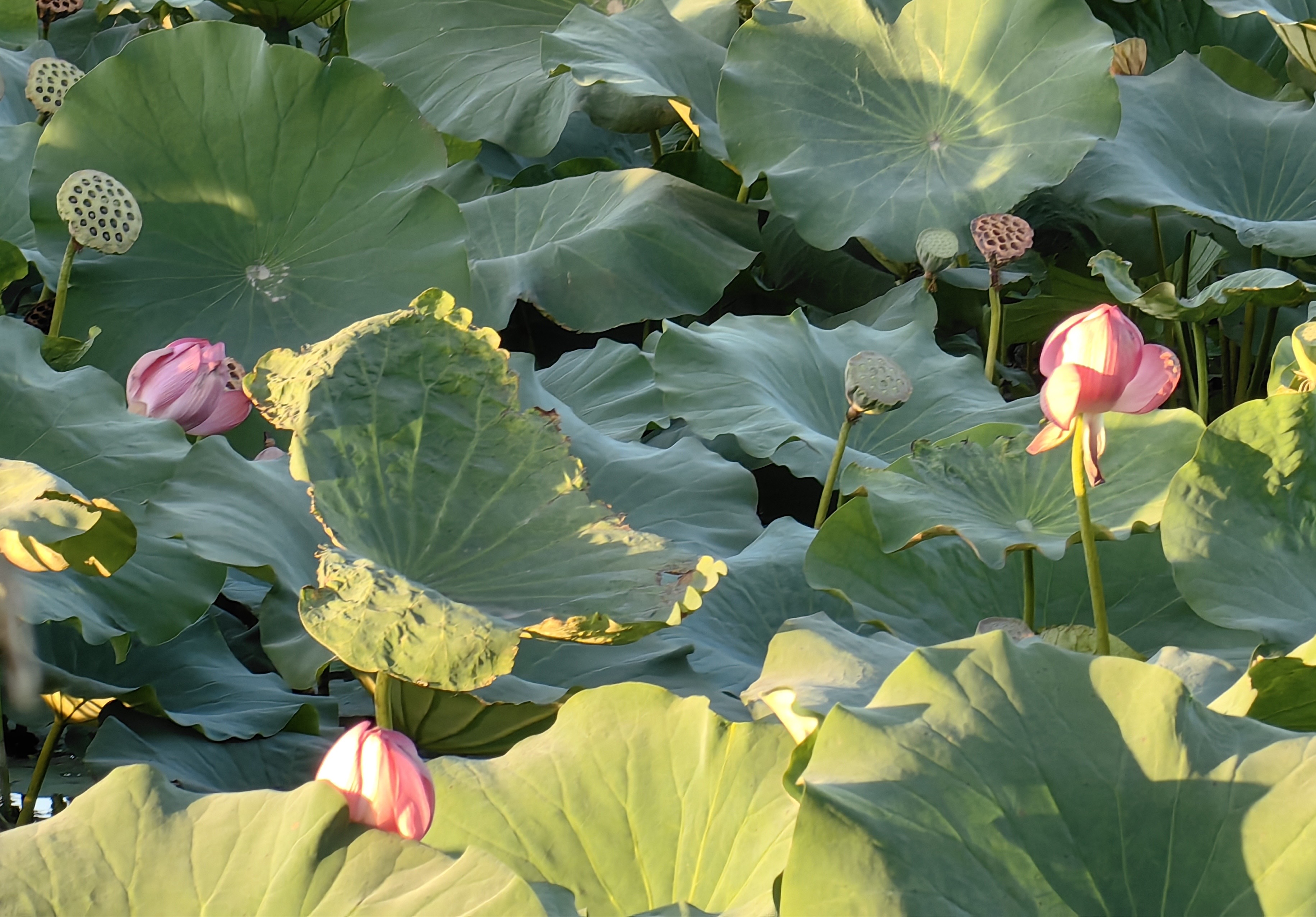 荷塘中,荷花隨著秋風搖曳,偶有幾片花瓣吹落水中,漾起一圈圈漣漪;連片的荷葉黃綠共存,映襯著落日余暉,散發(fā)著一種與世無爭的美麗。仲秋時節(jié)的荷花,雖不及夏季的繁盛,卻顯現(xiàn)出另一番獨特的韻味,讓人沉醉。