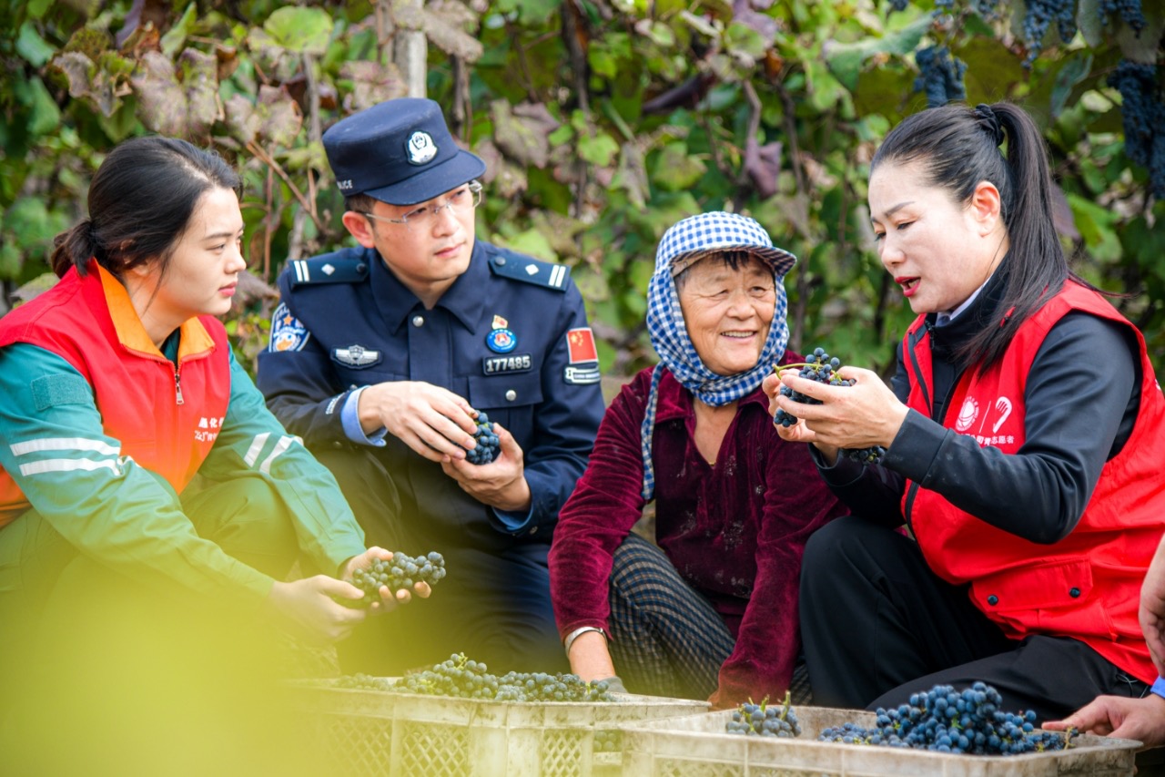 “兒子常年在外務工,家里就俺們老兩口。咱們民警每年都來幫著收葡萄,這次還和志愿者一起,相信一定有個好收成!”趙大娘高興地說。