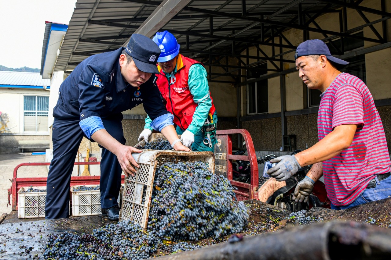 離開趙大娘家的葡萄園,民警和志愿者們又來到祥和酒莊。他們擼起袖子,與村民打成一片,將一筐筐葡萄倒入傳送帶實現枝肉分離。經過1個多小時的連續作業,完成了50余車葡萄的搬運、過稱、清筐、篩選等工作。供電公司的志愿者們還發揮專業優勢,幫助酒莊檢修用電設施,宣傳安全用電常識。
