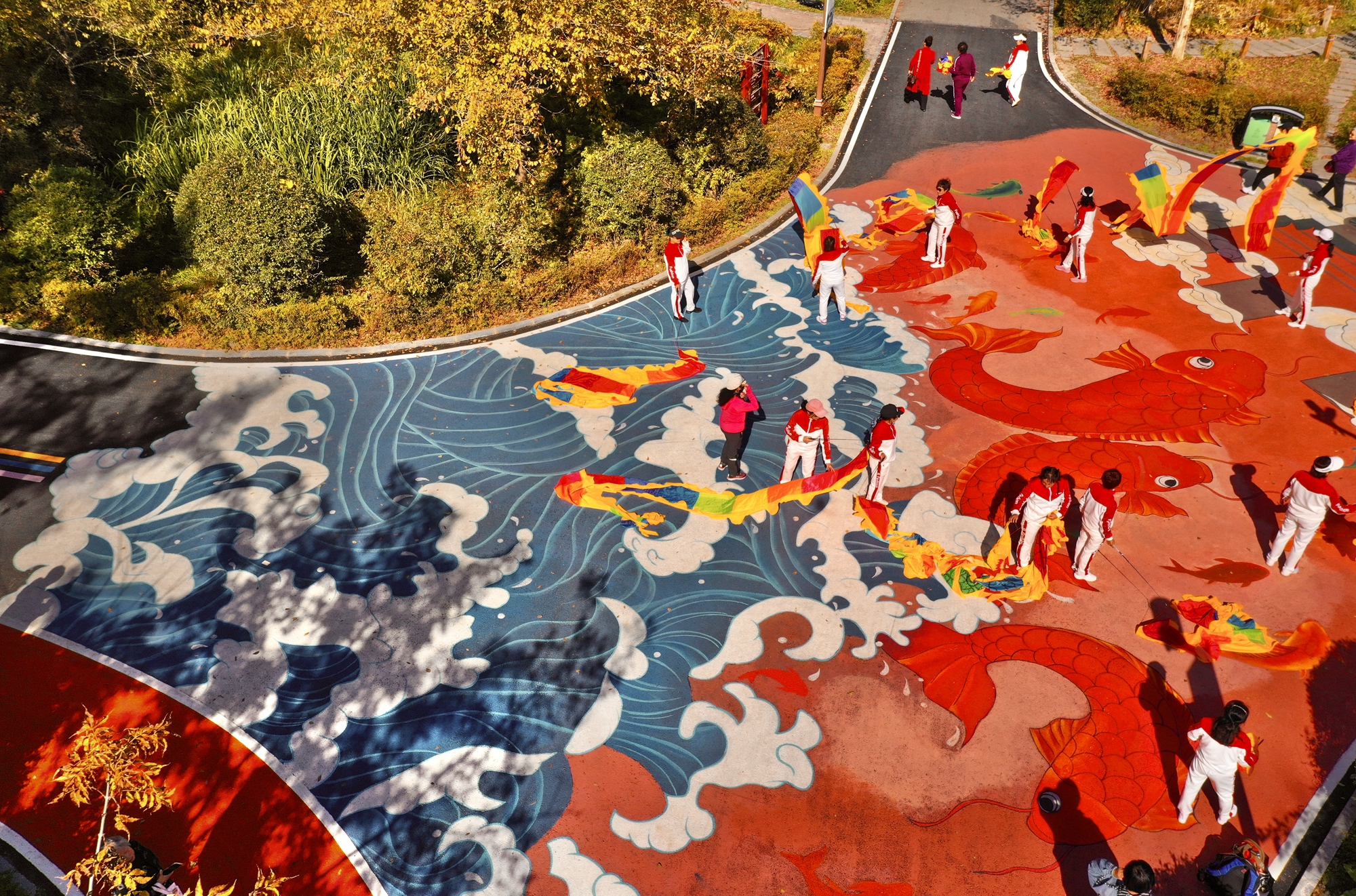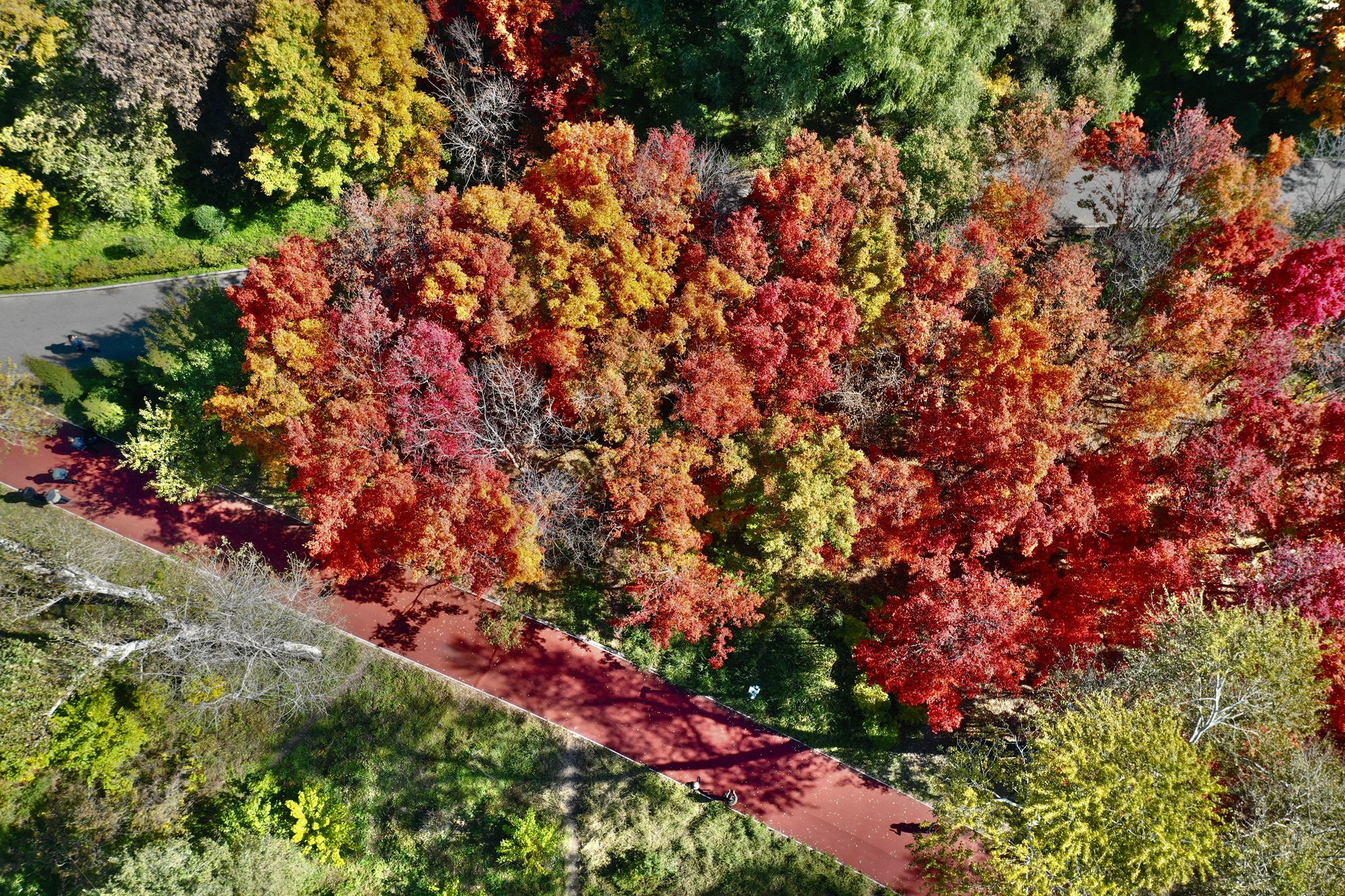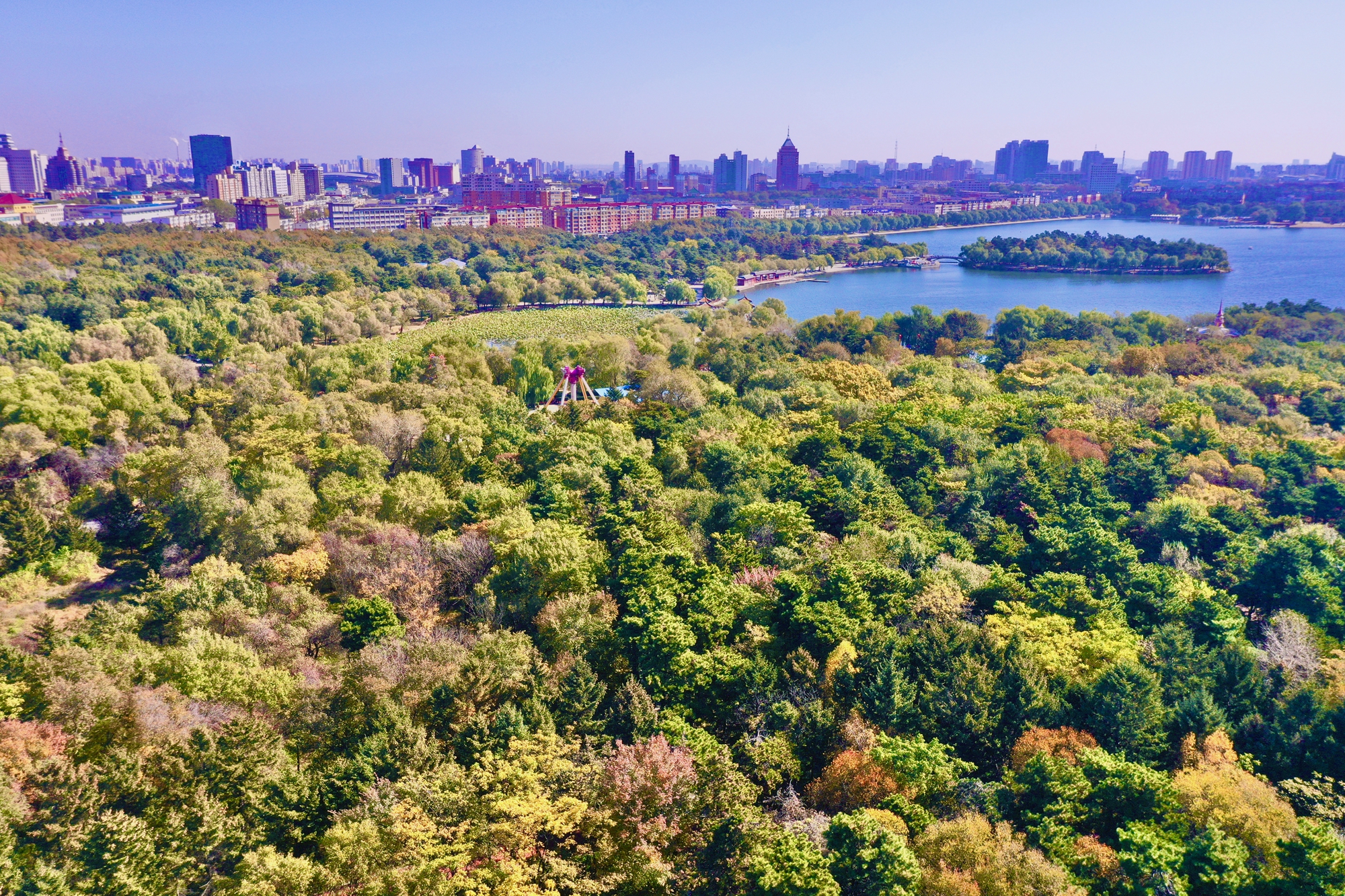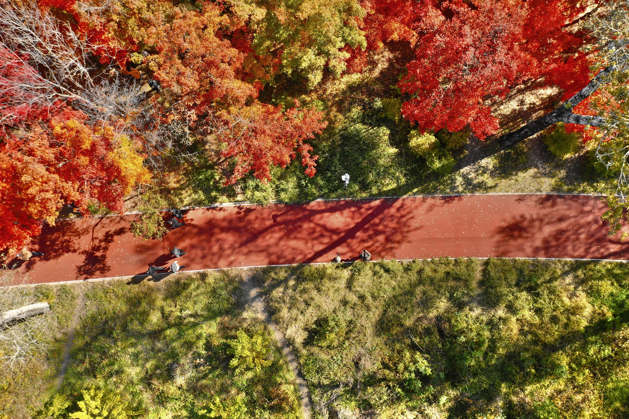 俯瞰南湖公園,層林盡染,色彩艷麗,紅色的步道如同一條蜿蜒的絲帶,穿梭在綠樹、黃葉之間。遠處的湖水波光粼粼,與周圍的秋景融為一體,構(gòu)成了一幅天然的畫卷。那層次分明的搭配,讓人仿佛置身于一個童話世界中,忘卻了塵世的喧囂和煩惱。