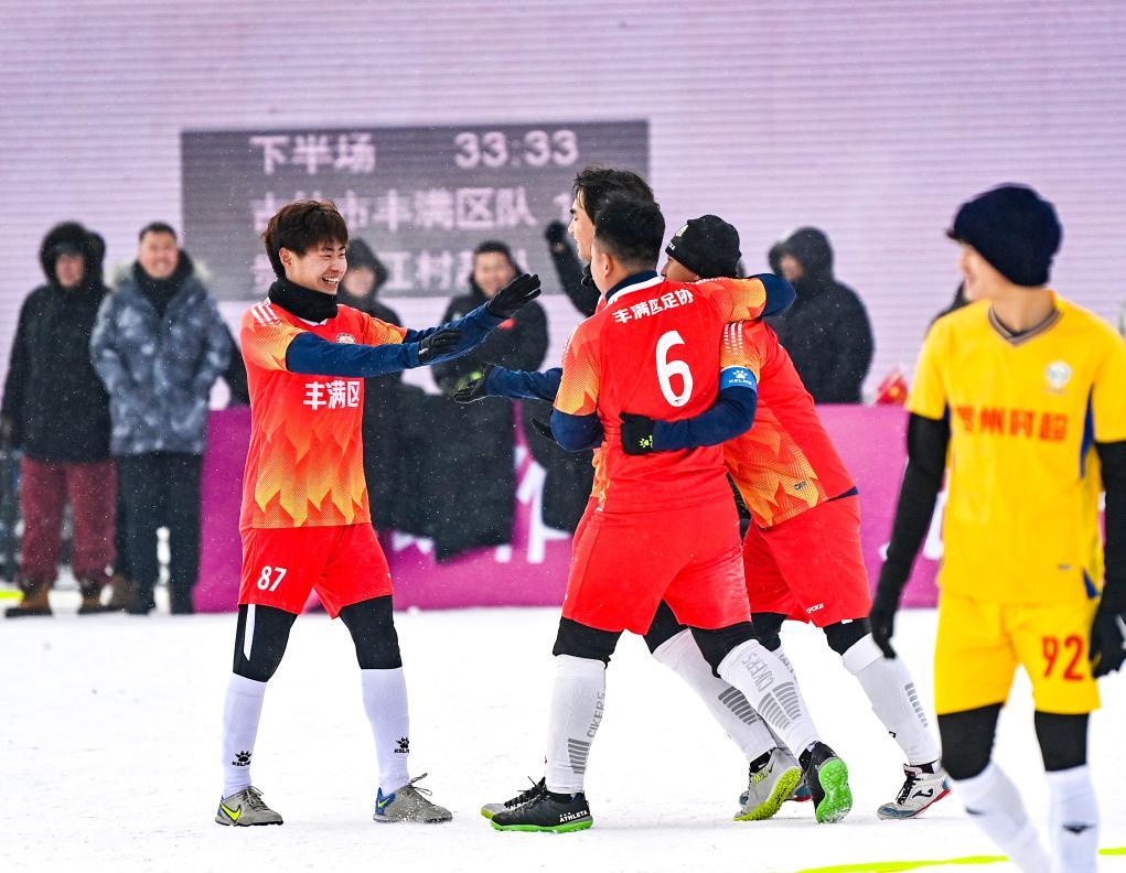 ↑12月23日,吉林市豐滿區(qū)代表隊(duì)在比賽中慶祝進(jìn)球。新華社記者 顏麟蘊(yùn) 攝