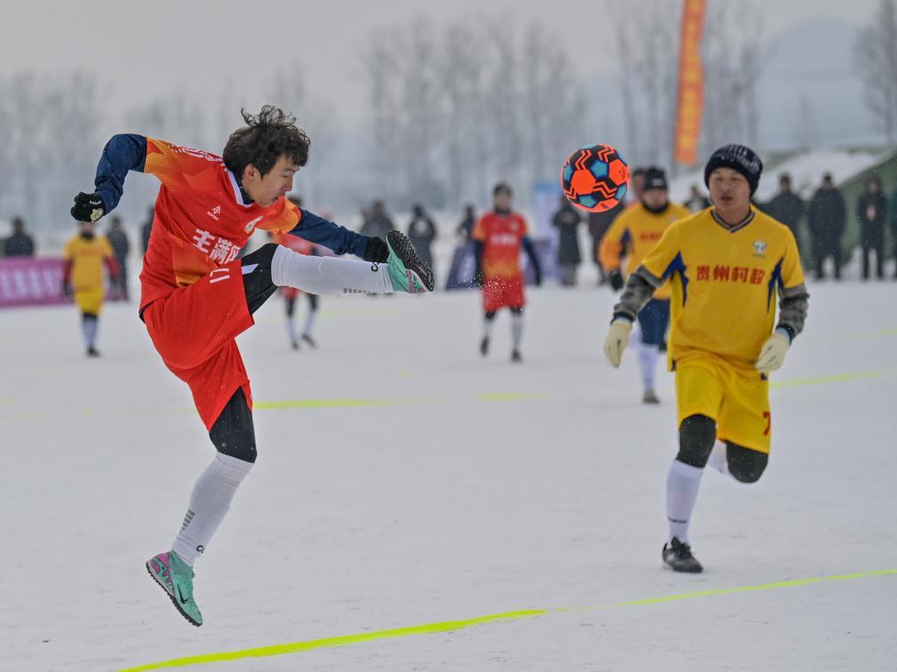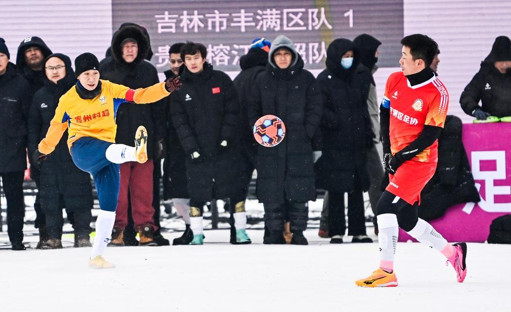 12月23日,南北鄉(xiāng)村雪地足球邀請(qǐng)賽在吉林省舒蘭市小城鎮(zhèn)南陽(yáng)村舉行。貴州省榕江縣的貴州村超隊(duì)從3000公里外遠(yuǎn)赴東北,與東道主吉林市豐滿區(qū)代表隊(duì)在冰天雪地中開(kāi)展一場(chǎng)友誼賽。