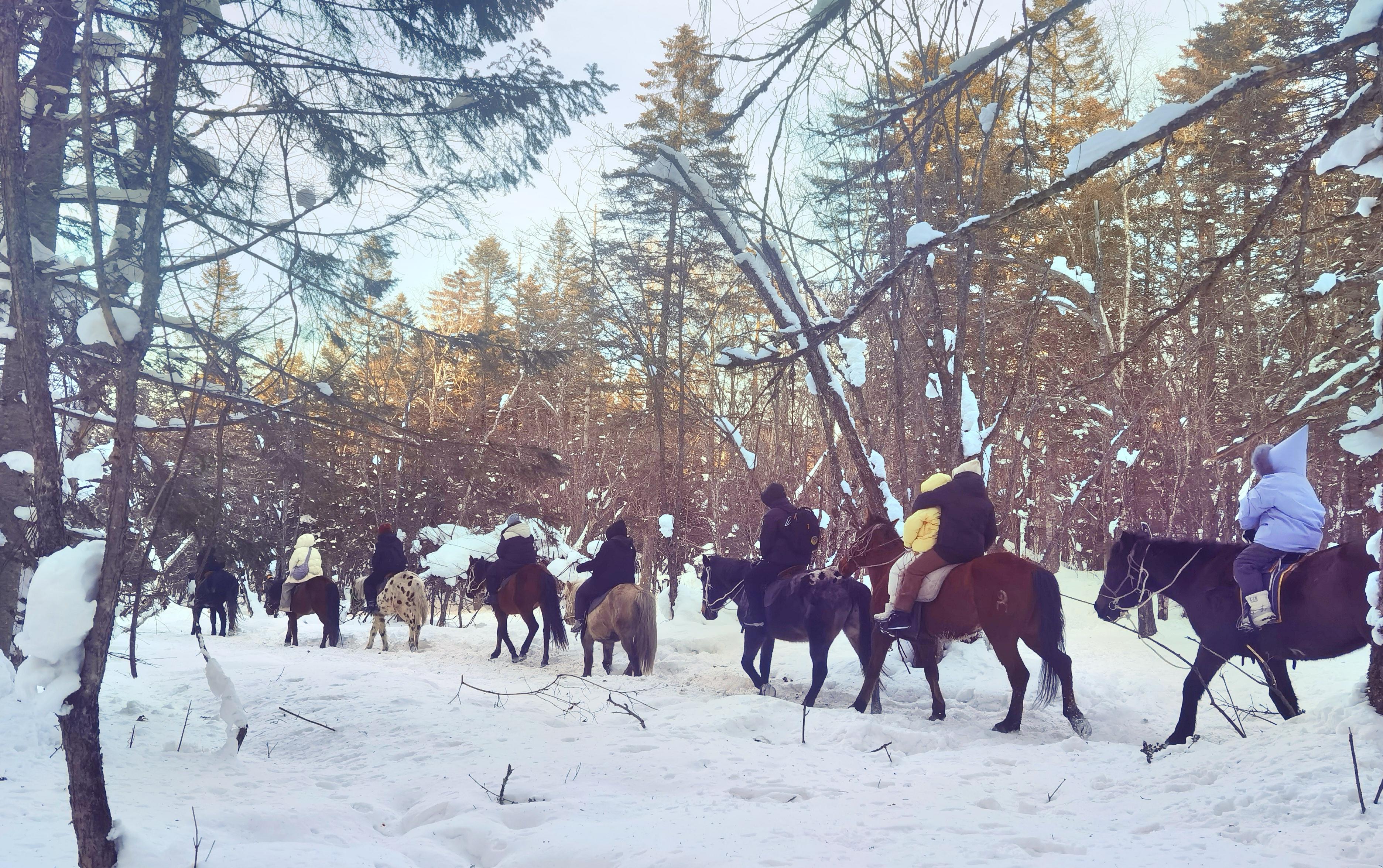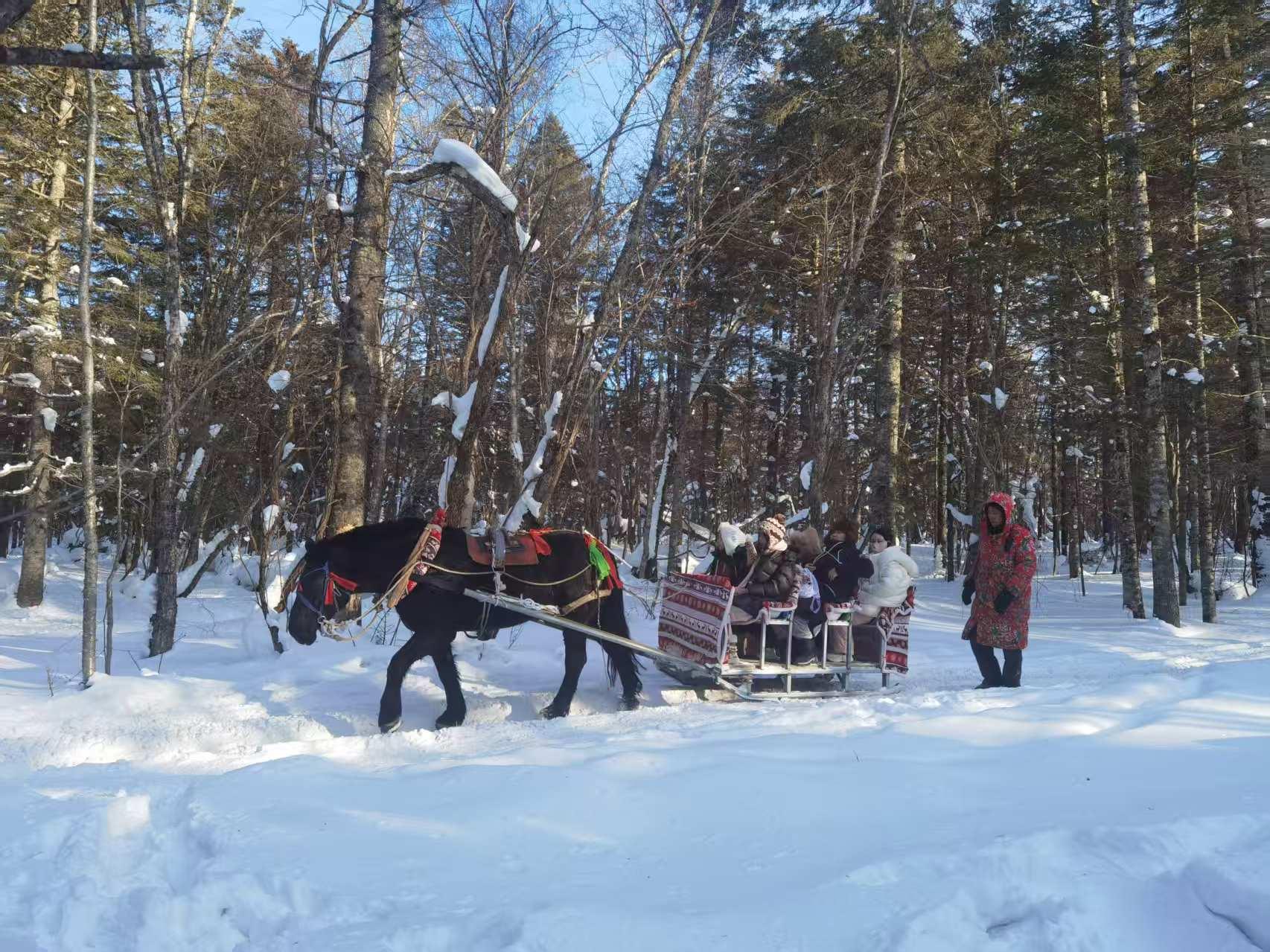 在景區(qū)入口,廣東游客馬格選擇騎馬去驛站。陽光灑入林間,馬脖子上的鈴鐺搖曳作響。馬格坐在馬背上,穿行在林海雪原,舉起手,當林間的冷空氣吹過,她感嘆道:“美得有點不真實。”