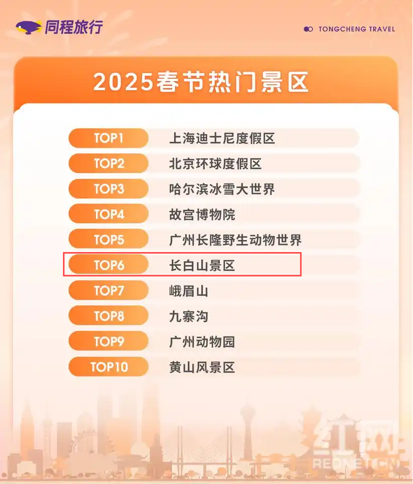 北上賞雪南下看海,是歷年國內游客冬季出行的熱門選擇。進入2025年,國內冰雪游熱度持續高漲,滑雪、追極光、住土炕等特色文旅體驗吸引了眾多南方游客。同程旅行數據顯示,2025年春節期間,長白山景區進入春節熱門景區榜單TOP10。