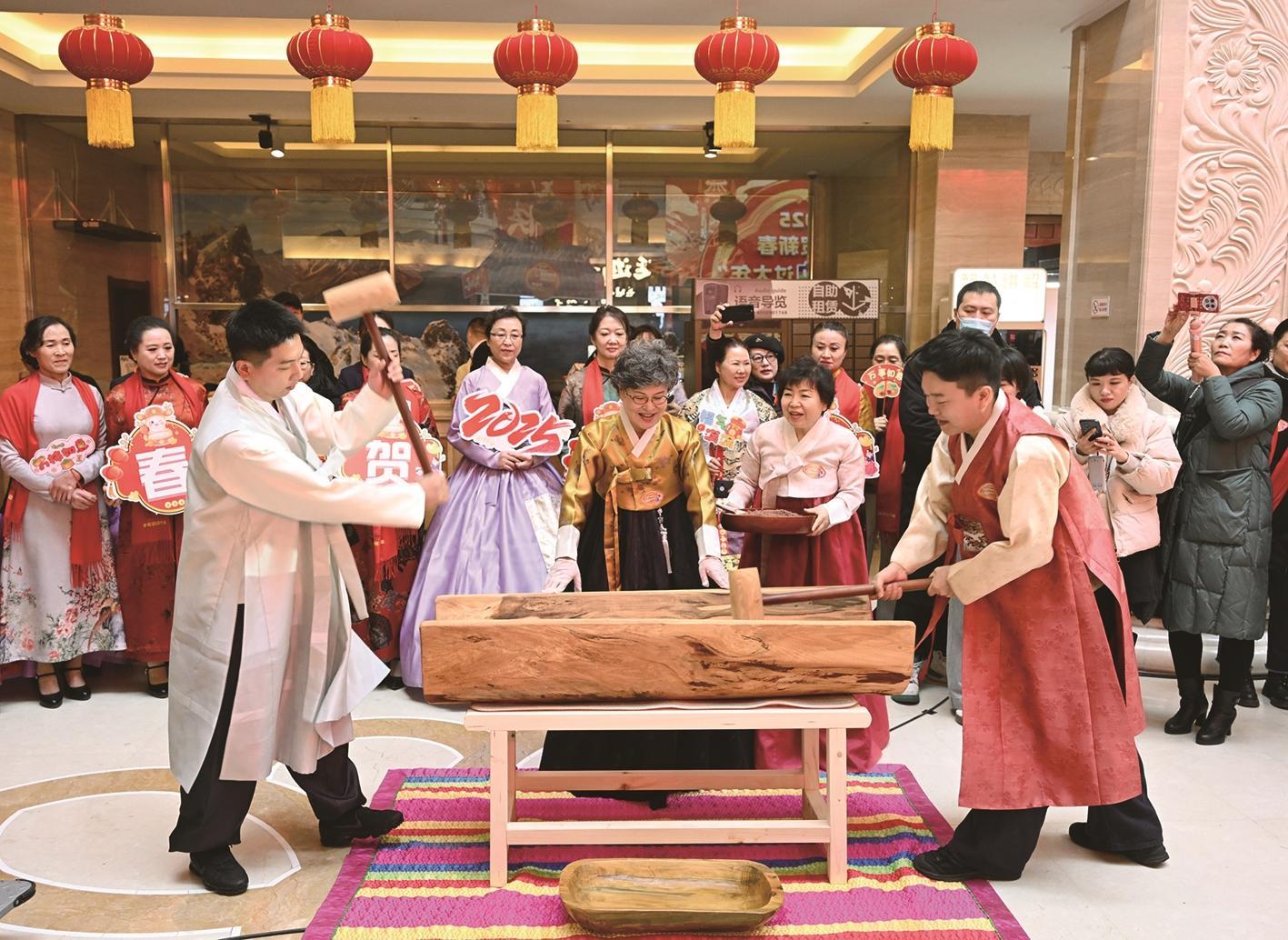 近日,2025年“非遺賀新春——延邊過大年”系列活動在延邊博物館啟動。圖為活動現場向游客展示朝鮮族打糕的制作。 延吉市委宣傳部 供圖