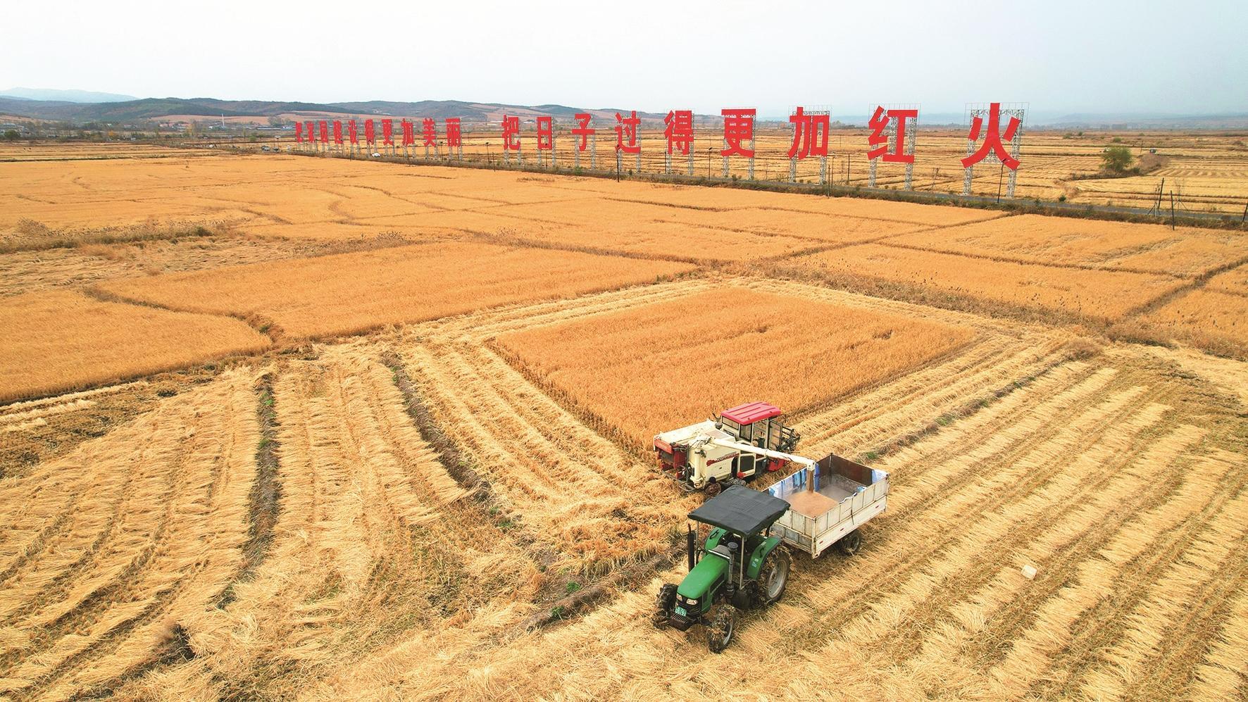 大型收割機在田間工作,轟鳴聲響徹田野。圖為和龍市光東村秋收場景。(資料圖片) 和龍市委宣傳部 供圖