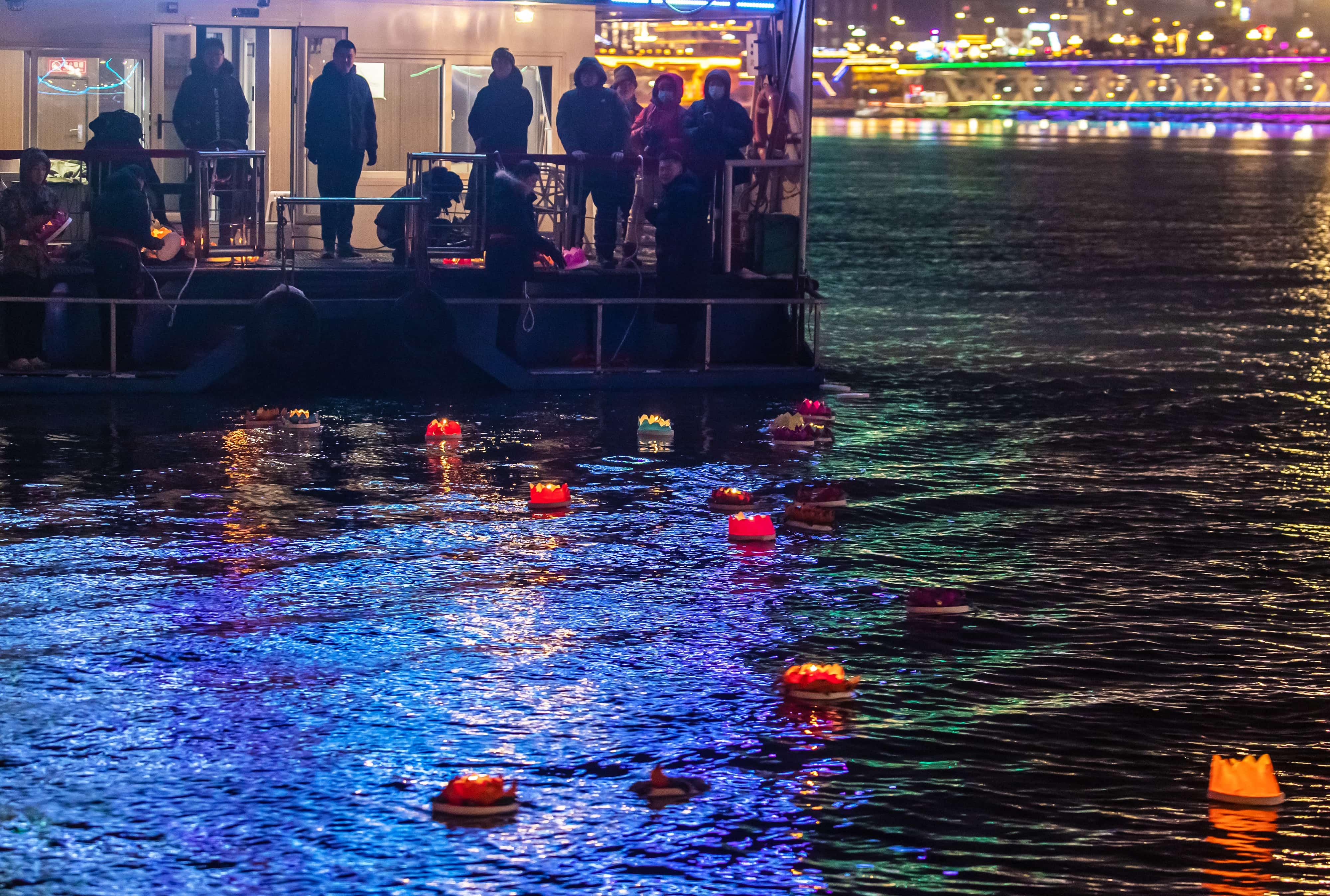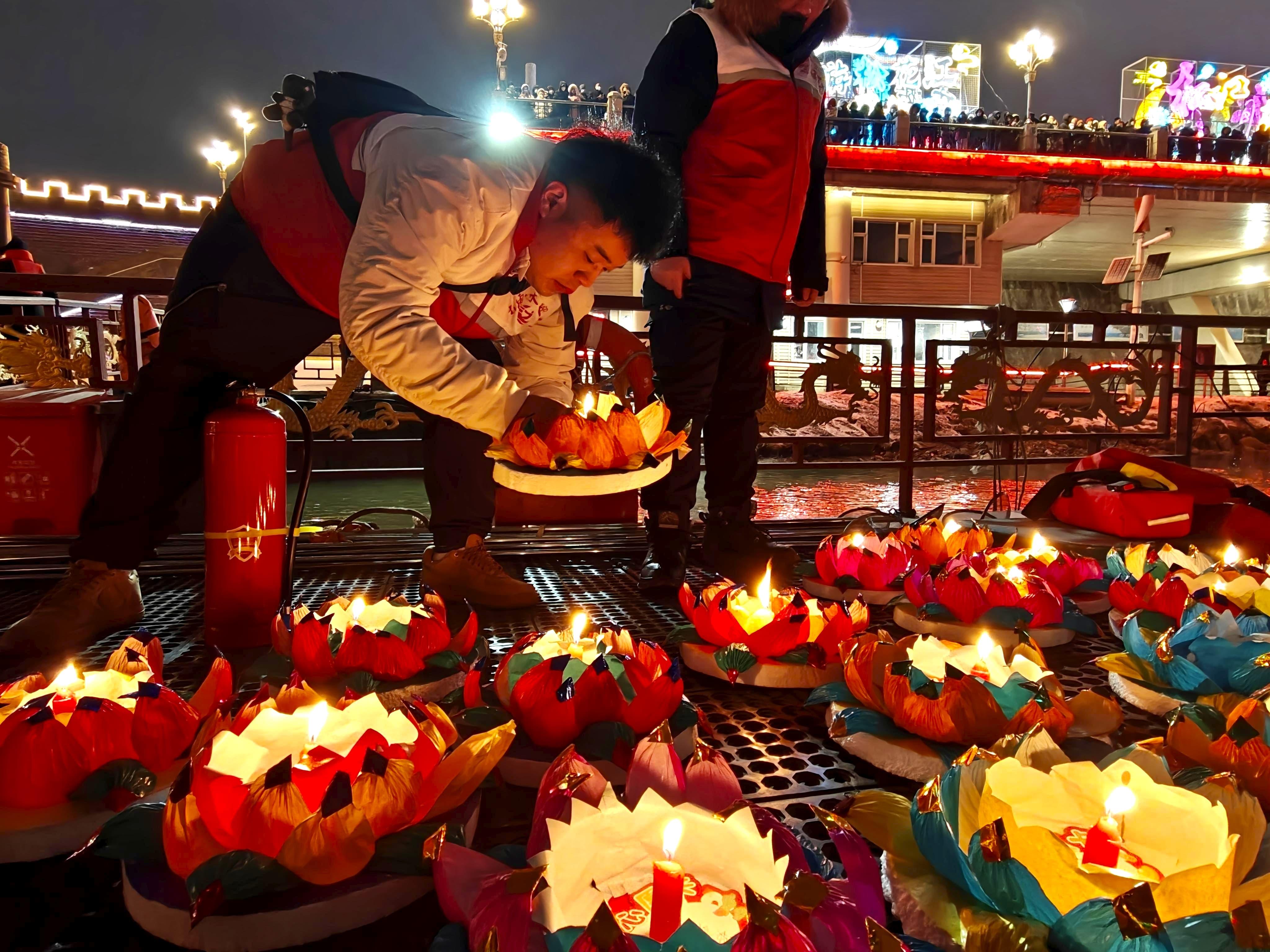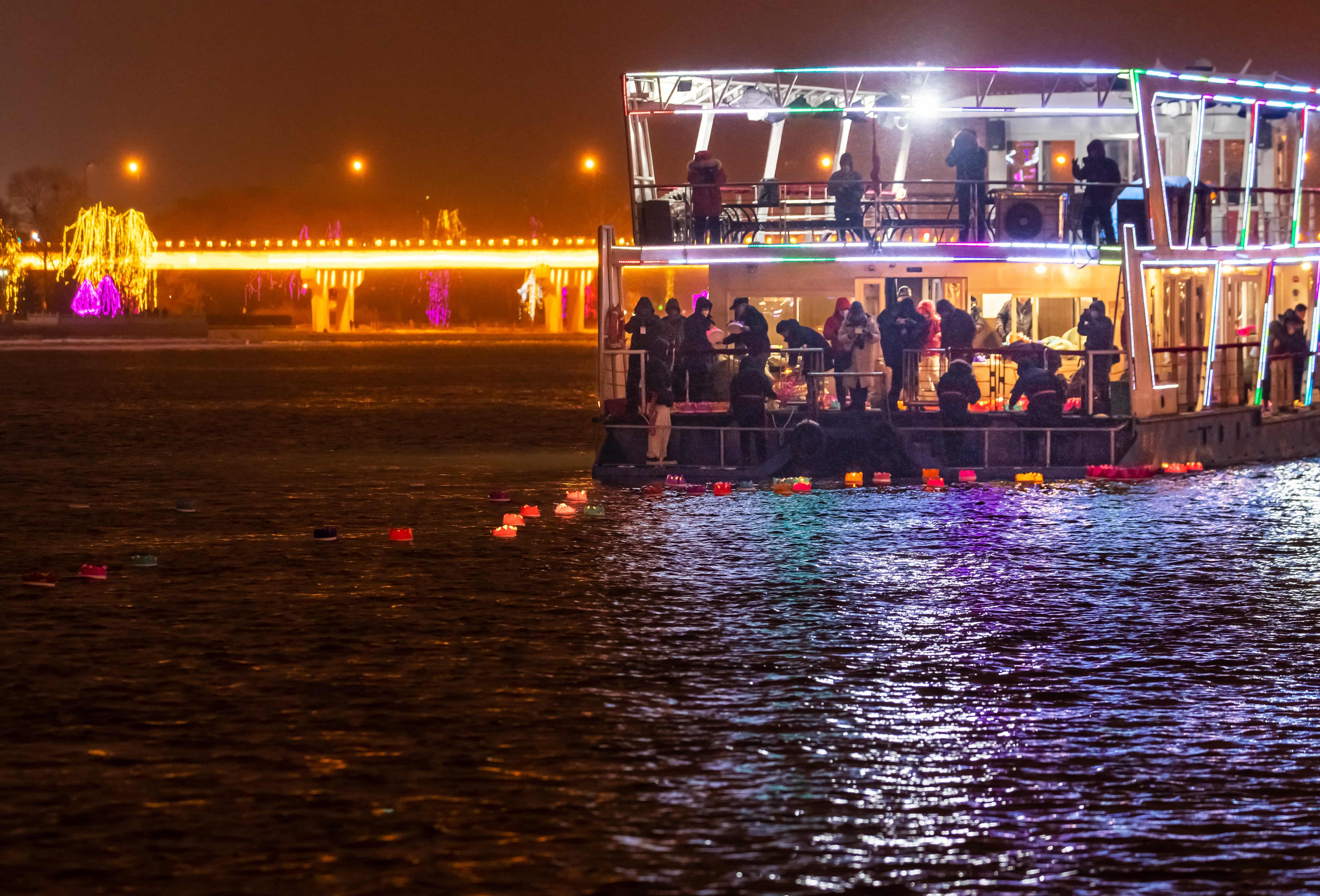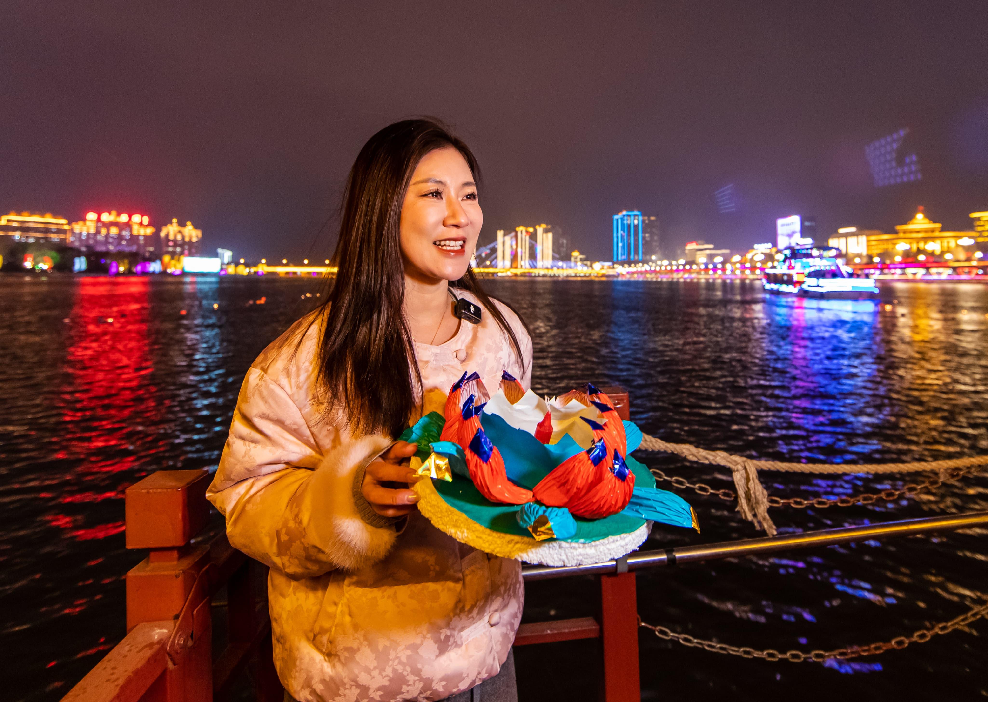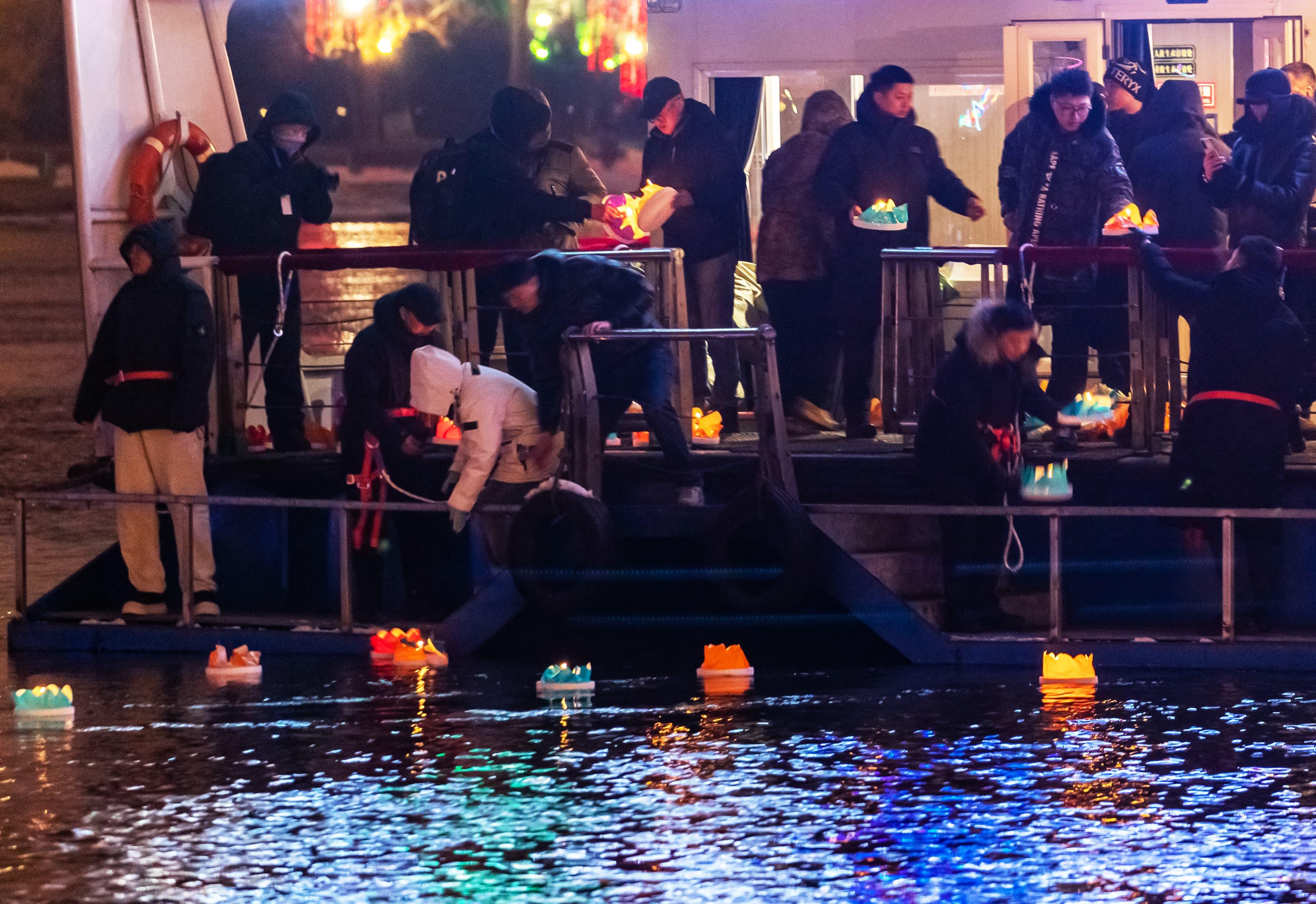 元宵佳節當晚,夜幕降臨后的吉林市松花江畔,彩船游弋、河燈閃亮、圓月當空,一盞盞承載著美好祈愿的河燈順水而下,在夜色中閃爍,與圓月相映成趣,如夢如幻。彩船、河燈、圓月,共同勾勒出蛇年元宵的“松江花月夜”。張景峰攝