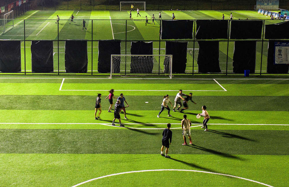 ??市民在成都市錦江體育公園足球場里玩飛盤。