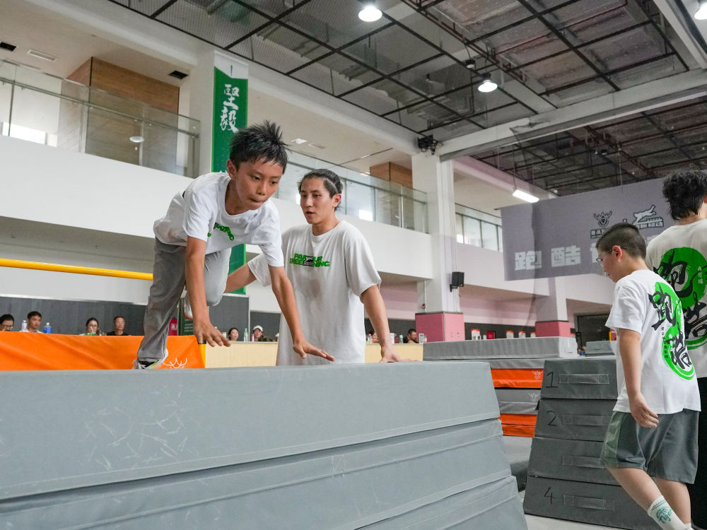 ??8月5日,在成都一家跑酷訓練基地,小朋友在練習跑酷。新華社記者 王曦 攝