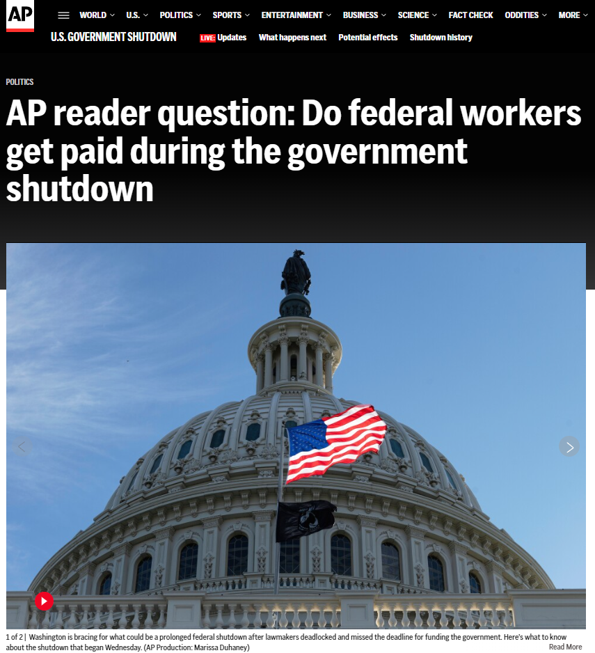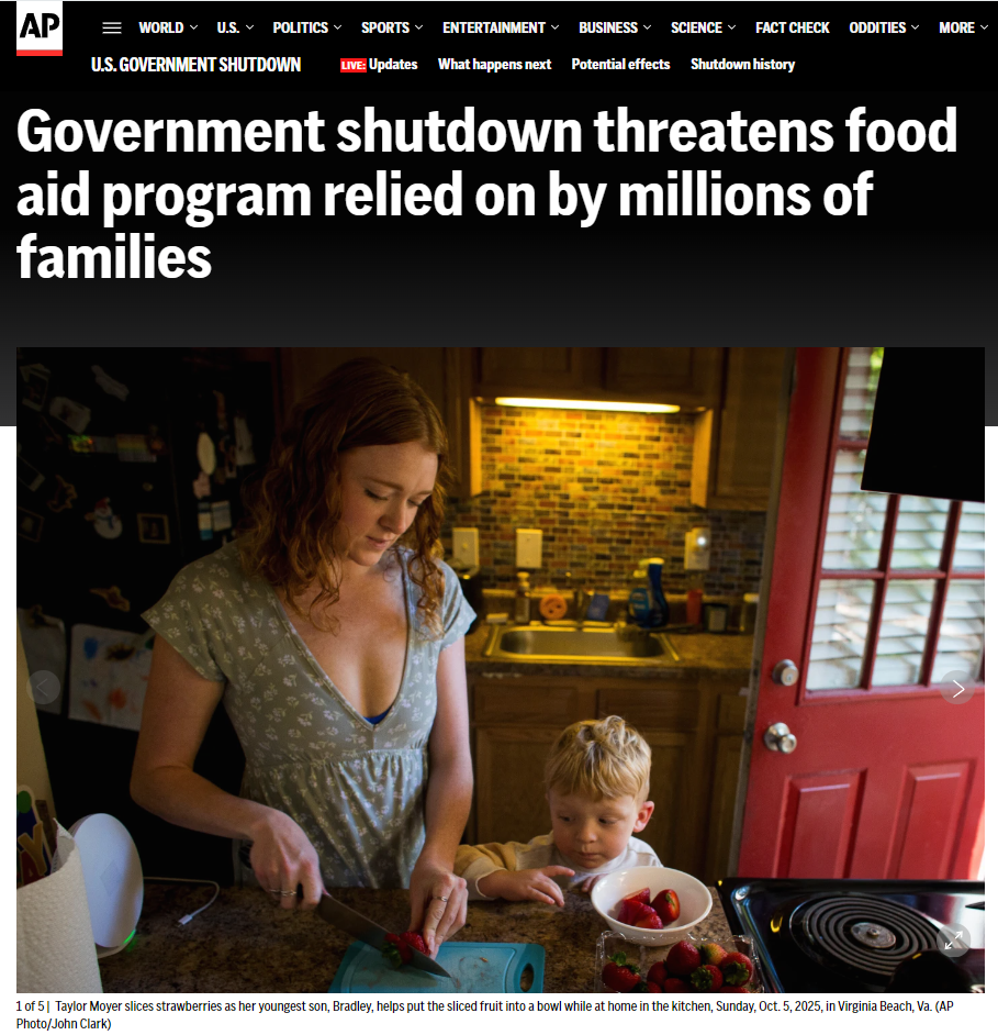 美聯社在一篇有關低收入母親和幼兒的食品援助計劃的報道中說,政府持續“關門”將會影響到這一項幫助 600 多萬低收入母親和幼兒的食品援助計劃的實施。