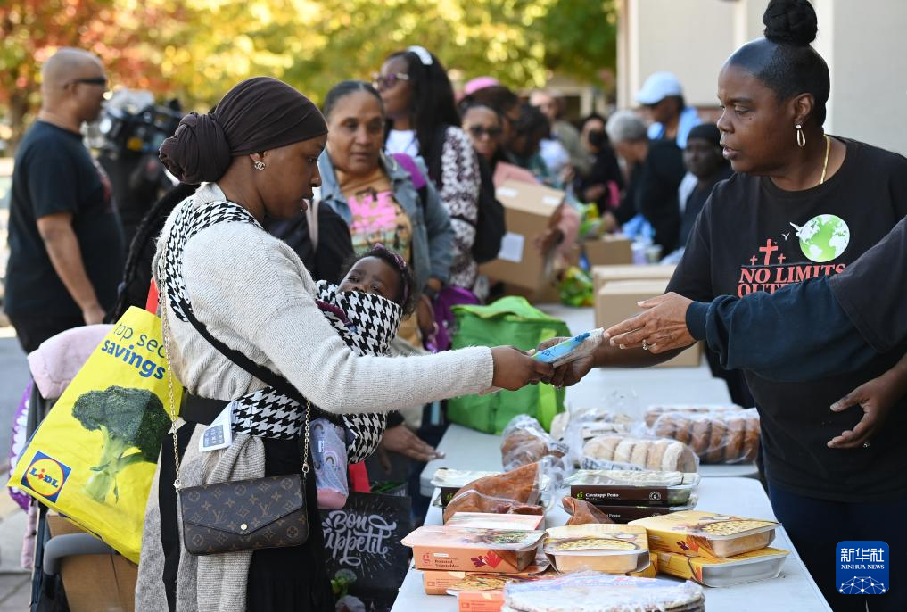 10月21日,在美國馬里蘭州海厄茨維爾市,聯邦雇員領取免費食品。新華社記者 李睿 攝