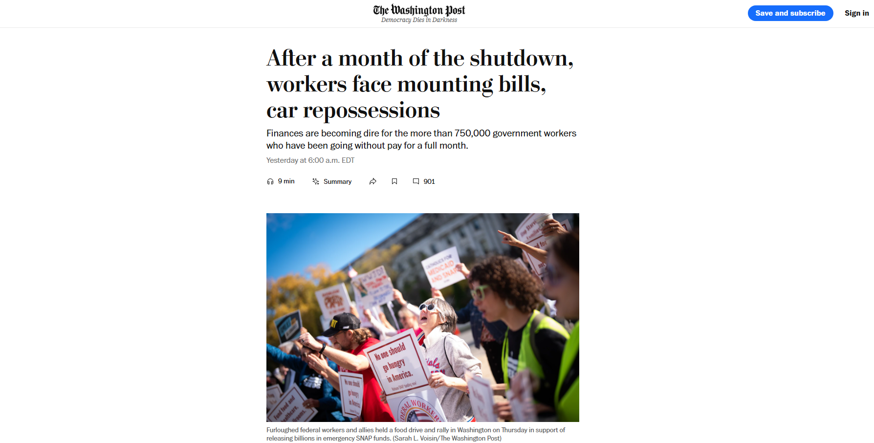 《華盛頓郵報》同一天也刊文稱,從本周末開始,美國政府關門將對依賴聯邦食品救濟的美國人產生直接影響。沒有“補充營養援助計劃”,一些靠食品券生活的美國民眾已經開始沒有辦法為食物買單。