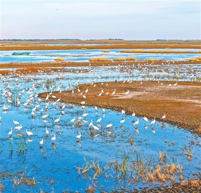 二龍濤河淺水濕地吸引了大量白鶴停歇覓食。