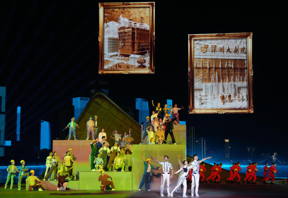舞臺(tái)上,象征改革開放歷程的建設(shè)者們接力登場(chǎng),劈山跨海,筑路架橋。他們帶著夢(mèng)想南下,以敢闖敢試、敢為人先、埋頭苦干的特區(qū)精神,闖出一片新天地。