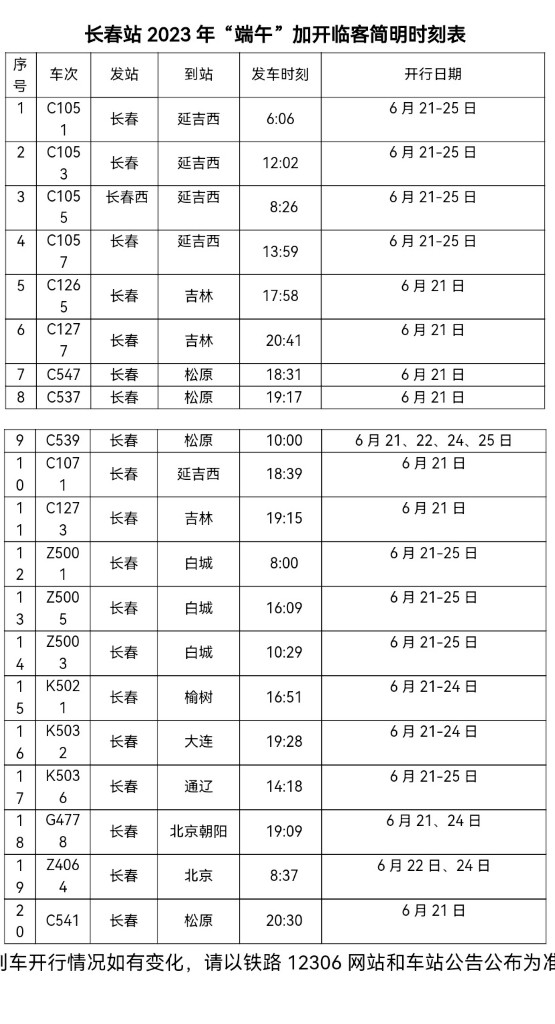 為應(yīng)對(duì)客流高峰,長(zhǎng)春站共加開松原、白城、延吉西、北京朝陽(yáng)、通遼、榆樹等方向臨時(shí)旅客列車20列,滿足旅客出行需求。