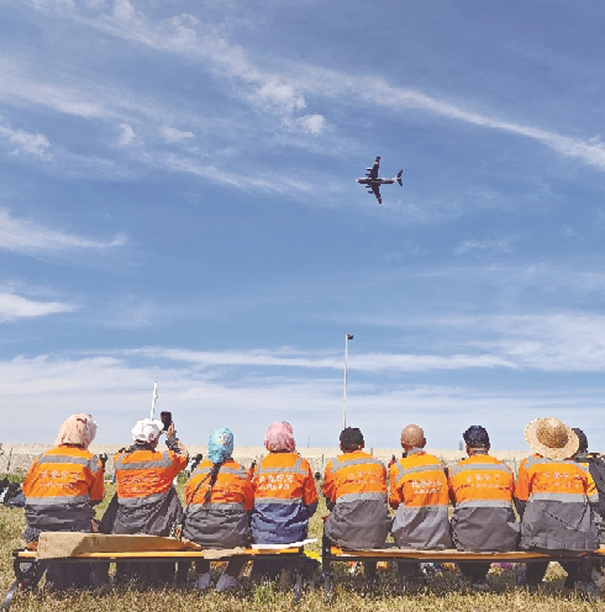 在剛剛落幕的2025空軍航空開放活動和長春航空展上,一張照片悄然走紅。照片中,運油-20掠過長春航空展上空,一群身著橙色工裝的環衛工人正坐在長椅上,以最樸素的姿態仰望長空。“鯤鵬”在藍天映襯下氣勢如虹,橙衣環衛工人們背影質樸,二者形成強烈而和諧的視覺沖擊,也勾勒出長春這座“航空城”全民共享藍天盛宴的溫情圖景。