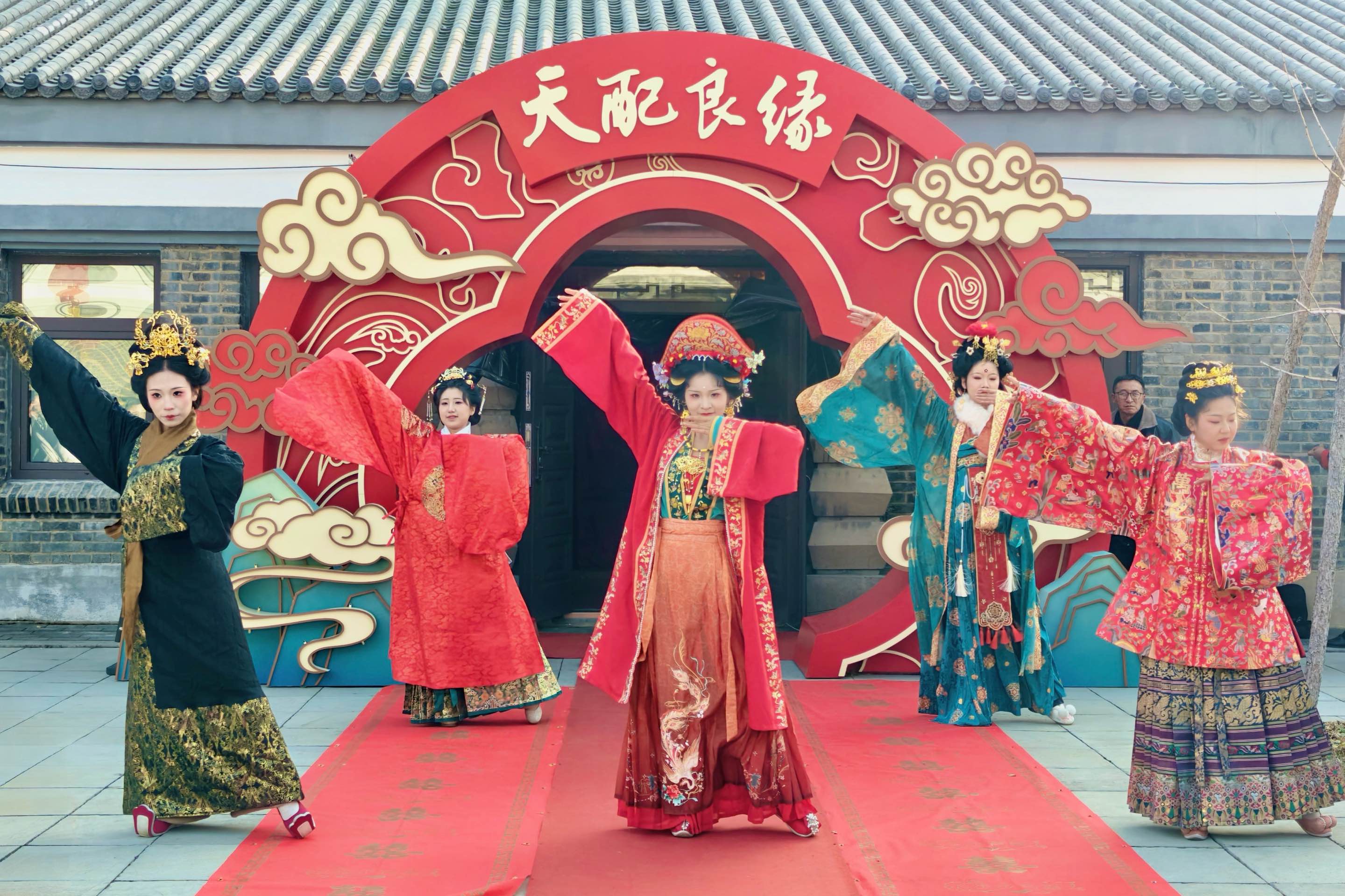 在吉林省民俗學(xué)會(huì)、長(zhǎng)春市松盛漢服藝術(shù)館支持下,開(kāi)幕式上的一系列演出也烘托了展覽的喜慶氛圍。在古代婚服走秀《衣冠上國(guó) 錦繡千年》中,身著唐、宋、明等朝代婚服的青年依次登場(chǎng),嗩吶手張亮亮吹響《百鳥(niǎo)朝鳳》《黑土地》,激昂旋律與古典婚服相映,盡顯千年婚服之美與婚俗之禮。