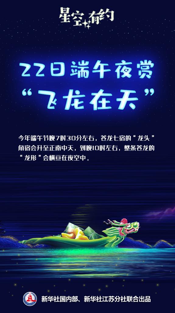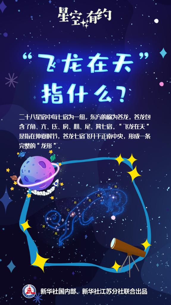 中科院天文科普專家介紹,22日端午節晚7時30分左右,蒼龍七宿的“龍頭”角宿會升至正南中天,到晚10時左右,整條蒼龍的“龍形”會橫亙在夜空中,公眾可以觀賞到“飛龍在天”天象。這條遨游在天上的“飛龍”是什么?“飛龍”是如何飛上天的?