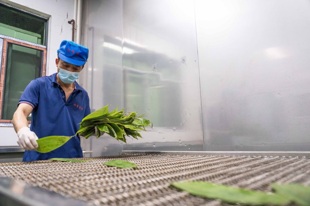 6月5日,在瀏陽市關口街道道源湖村一家粽子生產(chǎn)車間,工人把粽葉放在清洗機的運輸帶上。