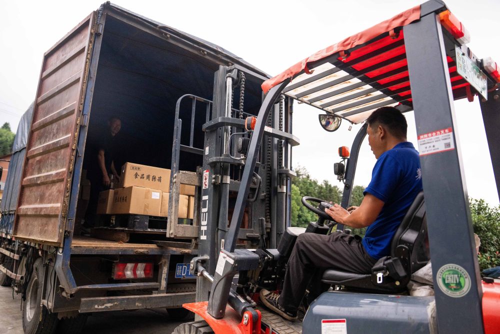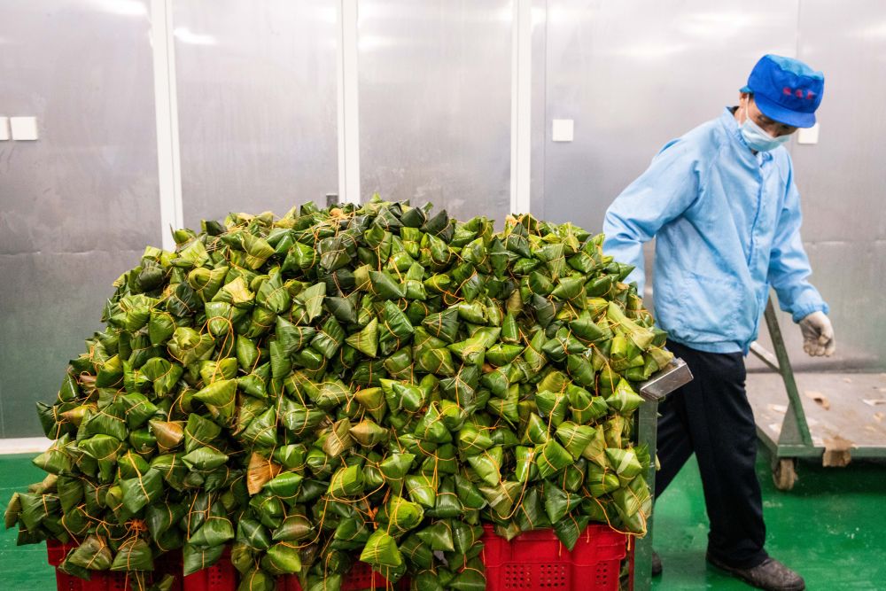 6月5日,在瀏陽市關口街道道源湖村一家粽子生產(chǎn)車間,工人在運輸打包好的粽子。