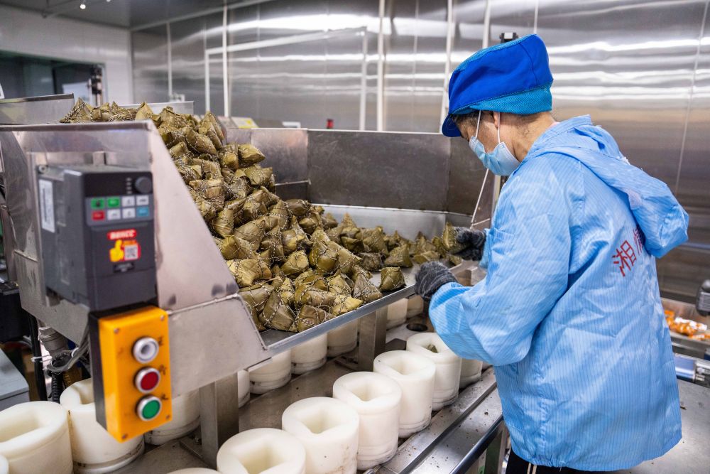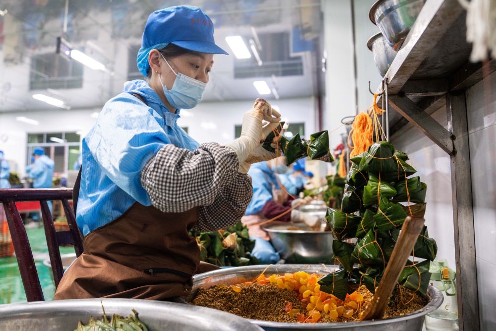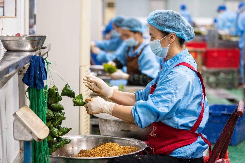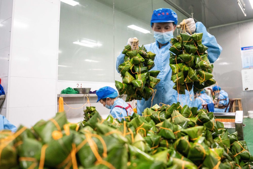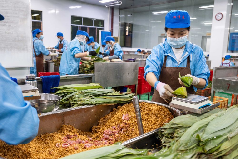 端午臨近,湖南省瀏陽市關口街道道源湖村多個粽子生產(chǎn)車間抓緊生產(chǎn)粽子。近年來,該村立足本地資源,通過生產(chǎn)規(guī)模化、配套體系化,推動粽子產(chǎn)業(yè)集群發(fā)展。據(jù)了解,道源湖村1308戶居民中有60%以上從事粽子生產(chǎn)相關工作,2023年該村粽子產(chǎn)業(yè)年產(chǎn)值超1.3億元。