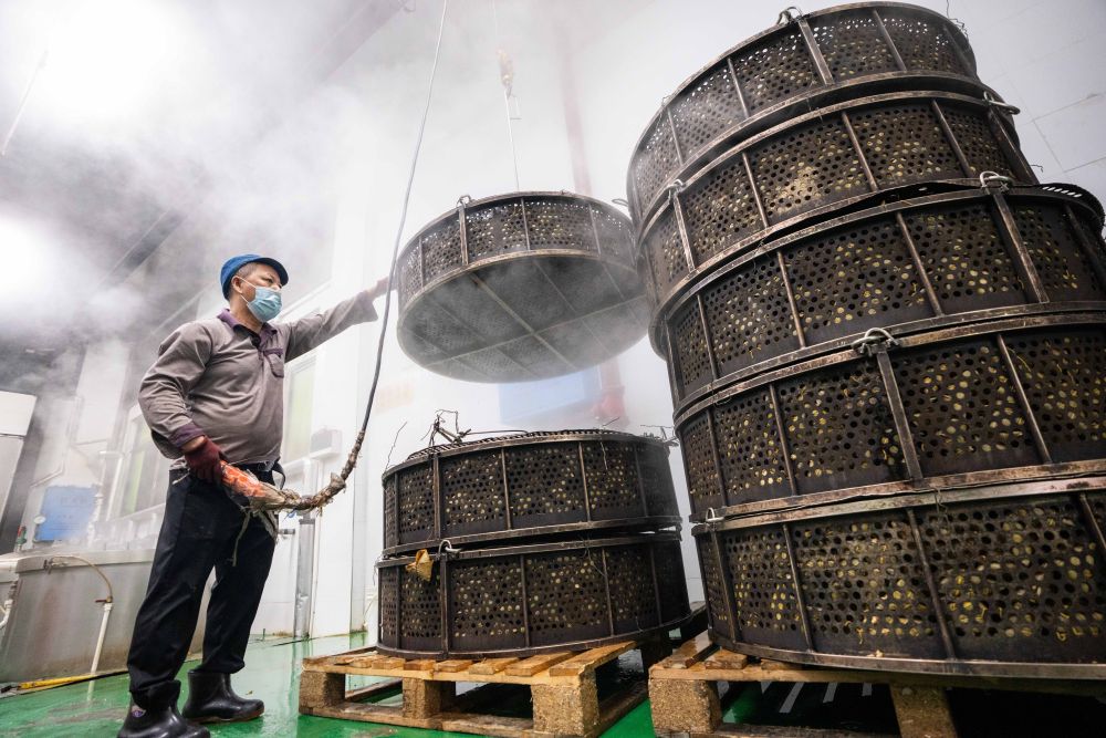 6月5日,在瀏陽市關口街道道源湖村一家粽子生產(chǎn)車間,工人在冷卻煮好的粽子。