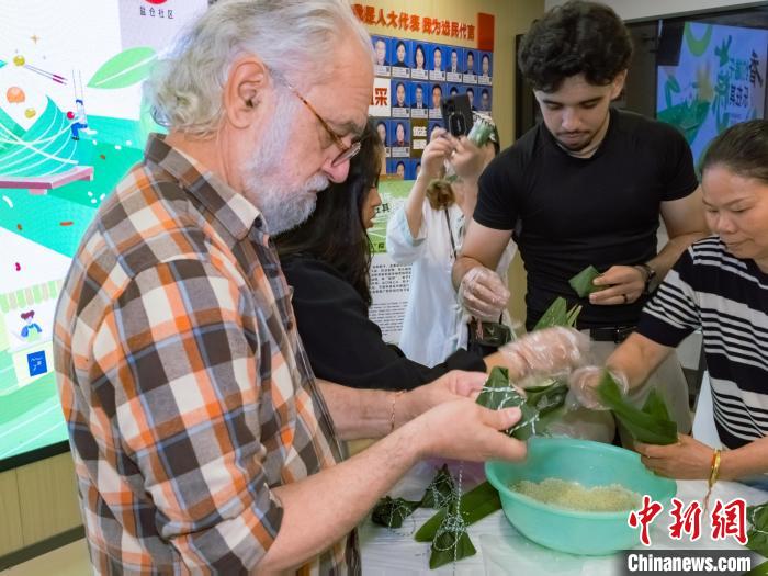 “端午節(jié)就要吃粽子,甜咸我都喜歡。”來(lái)自西班牙的“中國(guó)女婿”喬恩在該社區(qū)生活了十余年。活動(dòng)現(xiàn)場(chǎng),他用帶來(lái)的手風(fēng)琴為大家演繹了一曲《我愛(ài)你中國(guó)》,“雖然也會(huì)想念在西班牙的家人,但現(xiàn)在我的家在中國(guó),我很愛(ài)中國(guó),也很愛(ài)中國(guó)美食”。