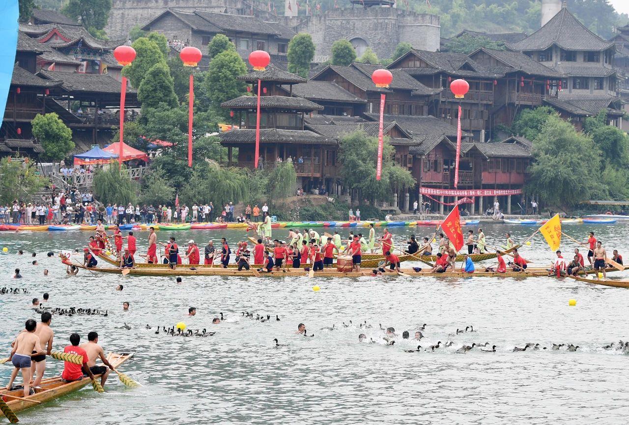 在貴州銅仁,中國傳統龍舟大賽火熱進行。銅仁是一個多民族聚居的寶地,這里的賽龍舟具有獨特的魅力。比賽前后,人們會進行一系列傳統民俗活動,如點龍睛、龍船下水、搶鴨子、垂釣等,充滿了地方風情。